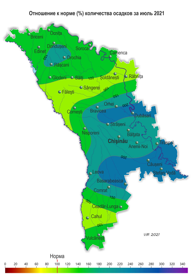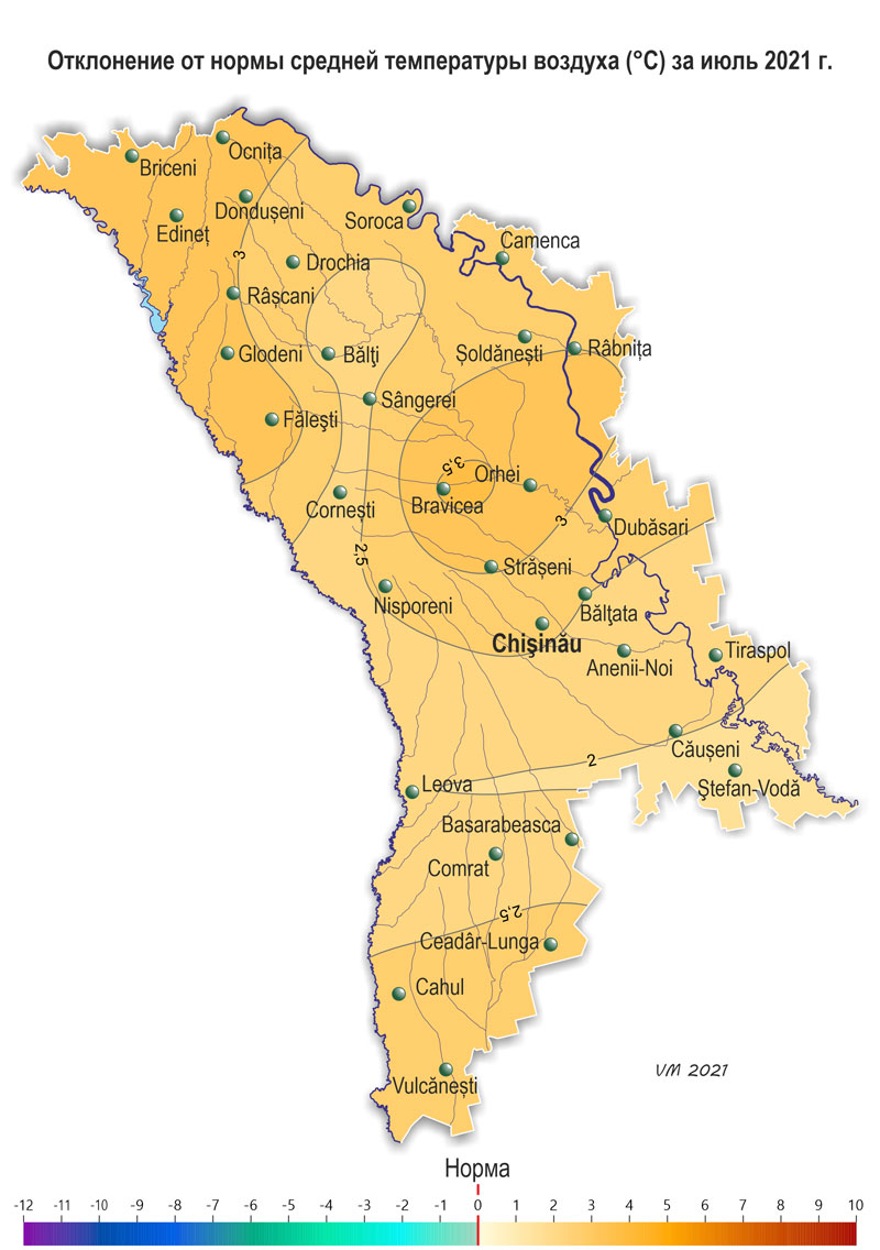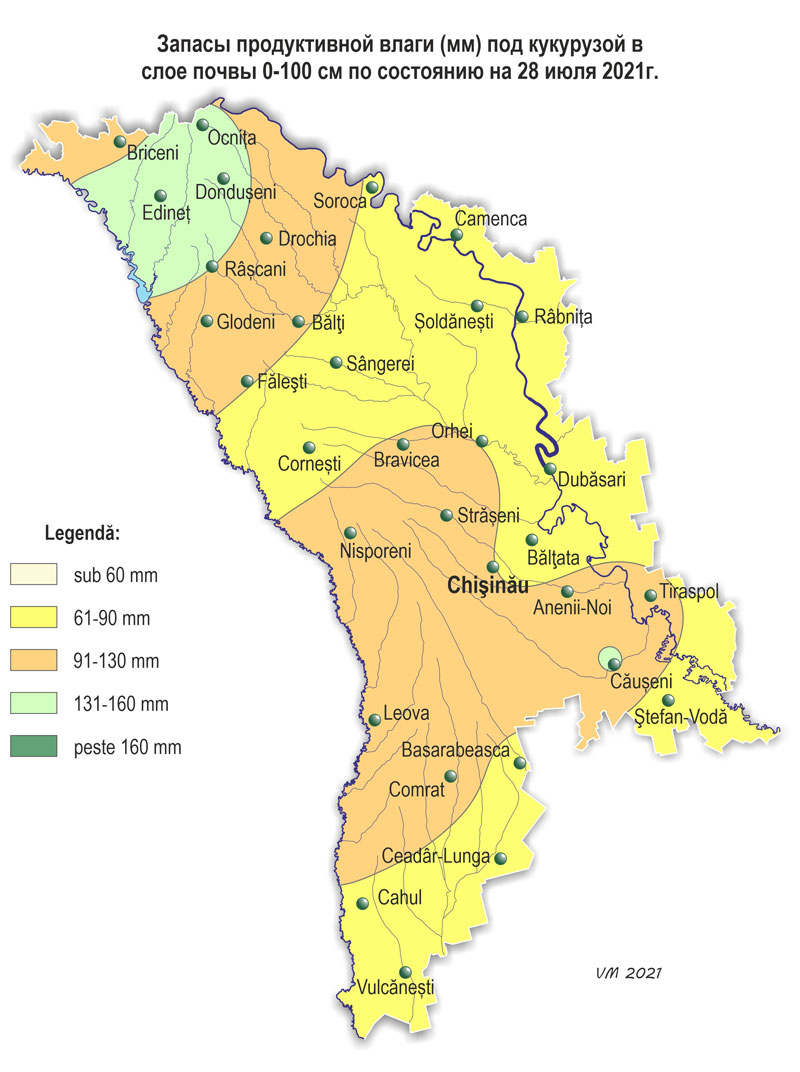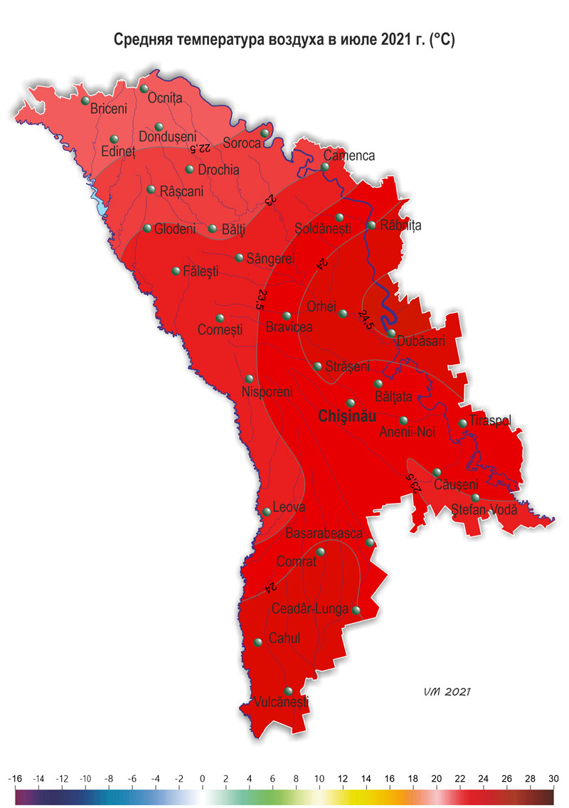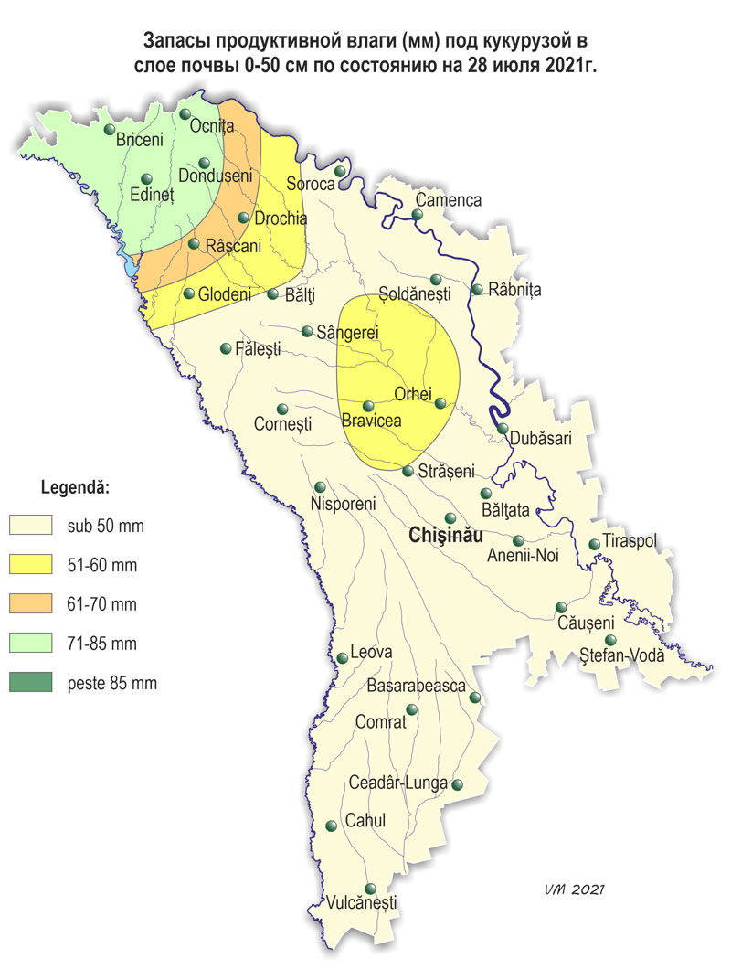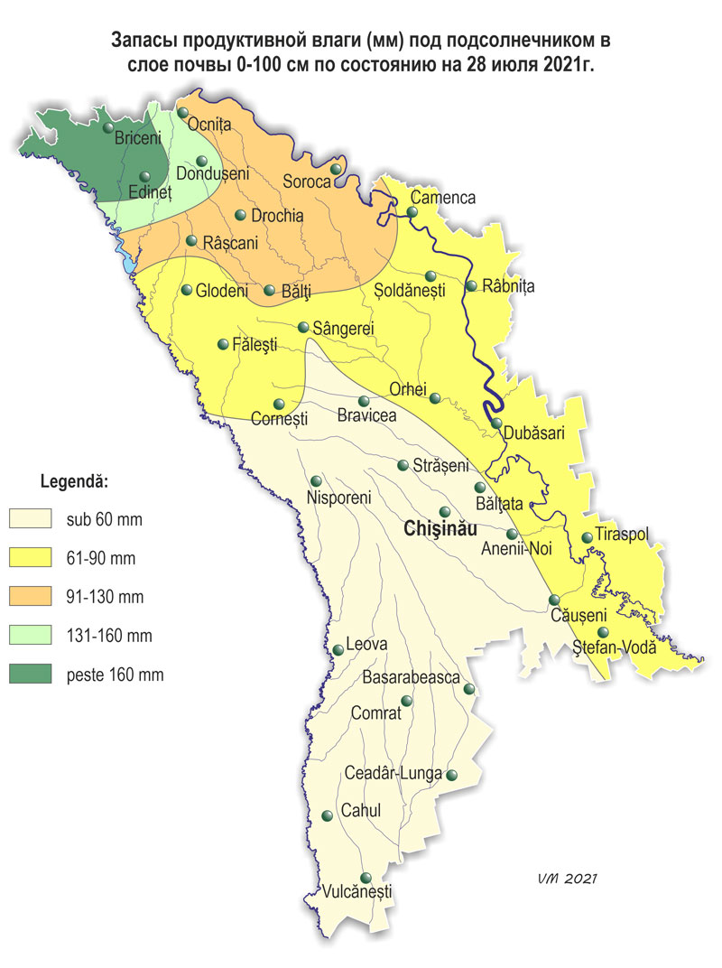В течение июля на территории республики наблюдалась жаркая с осадками погода. Средняя за месяц температура воздуха была выше нормы на 2,0-3,5ºС и составляла +22,5..+24,5ºС, что отмечается в среднем один раз в 5-15 лет. Максимальная температура воздуха повышалась до +37ºС (МС Фэлешть). Число дней с максимальной температурой воздуха ≥30ºС составило по территории от 9 дней до 20 дней (норма 3-11), с максимальной температурой ≥35ºС – 1-4 дней (норма - 1 день). Минимальная температура воздуха понижалась до +11ºС (МС Бэлцата). Cумма осадков за месяц на 95% территории cоставляла 45-135 мм (75-220% нормы), в отдельных южных районах их количество достигало 160-170 мм (245-295% нормы). Количество осадков по регионам составляло: - в северных районах – в основном 70-135 мм (100-155% нормы), местами 45-65 мм (55-90% нормы); - в центральных районах – 90-135 мм (110-205% нормы); - в южных районах – в основном 100-170 мм (190-295% нормы), местами – 45-70 мм (75-130% нормы). Прошедшие в отдельные дни месяца сильные дожди, местами с градом и сильным ветром, вызвали повреждения сельскохозяйственных культур и народнохозяйственных объектов, отключение электроэнергии. Погодные условия в течение месяца были в основном благоприятными для роста, развития и формирования урожая сельскохозяйственных культур. В начале июля у озимых культур на большей части территории республики отмечалась полная спелость, местами - восковая спелость. Во второй половине июля проводилась массовая уборка урожая озимых зерновых культур и к концу месяца она в основном завершалась. Условия для проведения уборочных работ были преимущественно благоприятными. У кукурузы в начале июля продолжалось листообразование, во второй половине месяца отмечалось цветение метелки, формирование и цветение початка, к концу месяца местами в южных районах началась молочная спелость. Высота растений к концу июля равнялась в основном 175-265 см. На одном растении кукурузы сформировалось в среднем два початка. По состоянию на 28 июля запасы продуктивной влаги в метровом слое почвы составляли: в северных районах – 85-150 мм (80-130% нормы); в центральных районах – 75-115 мм (80-120% нормы); в южных районах в основном – 75-130 мм (80-140% нормы), местами – 40-50 мм (50-70% нормы). У подсолнечника в течение июля отмечалось цветение и рост корзинки. Высота растений на конец июля равнялась в основном 175-210 см. Диаметр корзинки составлял в основном 15-21 см. По состоянию на 28 июля запасы продуктивной влаги в метровом слое почвы под подсолнечником составляли: в северных районах - в основном 80-120 мм (75-120% нормы), местами – 50-60 мм (50-65% нормы); в центральных районах – 60-75 мм (60-80% нормы); в южных районах – в основном 60-65 мм (65-70% нормы), местами – 25-30 мм (20-25% нормы). У сахарной свеклы в течение месяца продолжался рост корнеплода и отмечалось закрытие междурядий. У плодовых культур в течение июля продолжался рост плодов, у персика, абрикоса, сливы и ранних сортов яблок – созревание и сбор урожая. У винограда продолжался рост ягод. По состоянию на 28 июля запасы продуктивной влаги под многолетними насаждениями в метровом слое почвы составляли: в северных районах – 90-140 мм (80-125% нормы); в центральных районах – 75-155 мм (80-150% нормы); в южных районах – 80-110 мм (85-125% нормы).