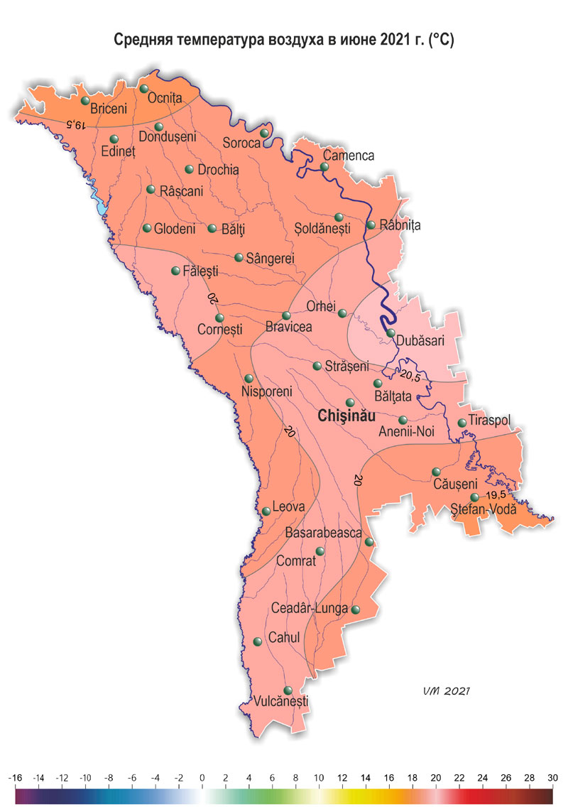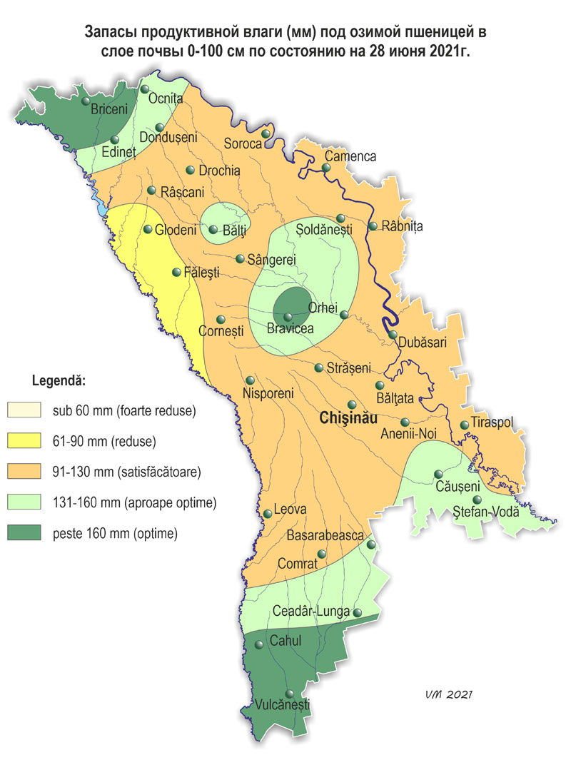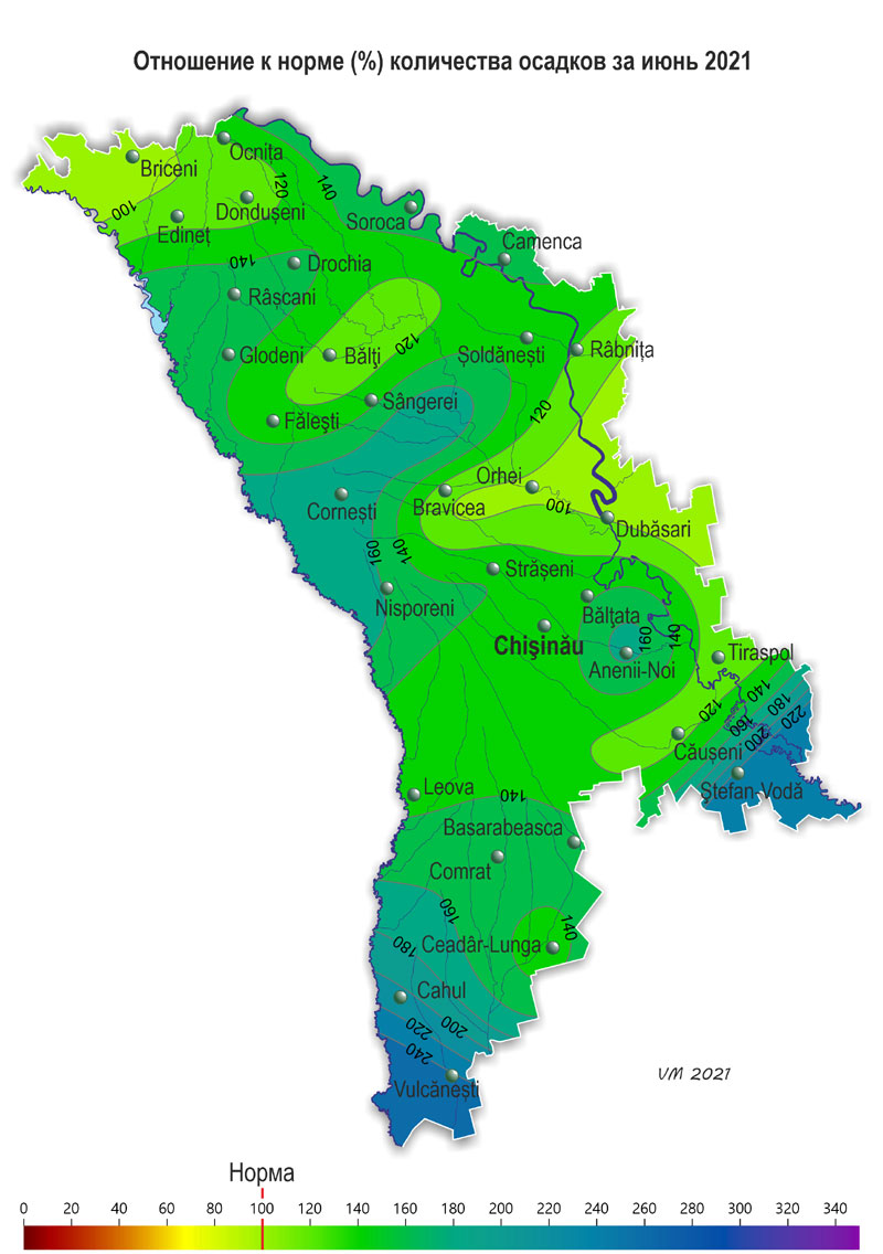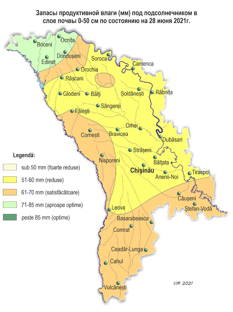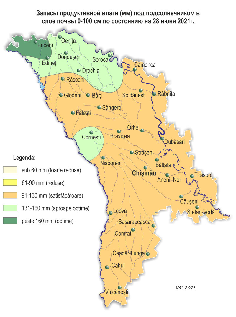 В течение июня на территории республики наблюдалась неоднородная по температурному режиму, с осадками погода. Средняя за месяц температура воздуха была в основном близка к норме, в северных и местами в центральных районах выше нормы на 1,0-1,5ºС и составила +19,5..+21,0ºС. Максимальная температура воздуха повышалась до +35ºС (метеорологическая станция Дубэсарь). Число дней с максимальной температурой воздуха ≥30ºС составило по территории 3-7 дней (норма 2-6). Минимальная температура воздуха понижалась до +7ºС (метеорологические станции Бравича, Кодрий). Осадки в течение июня выпадали неравномерно по территории и носили преимущественно ливневый характер. Общее число дней с осадками (≥0,1 мм) в июне составило по территории от 11 (Чадыр-Лунга) до 19 дней (Штефан-Водэ) при норме 10-13 дней. Сумма осадков за месяц на 85% территории составляла 68-125 мм (85-160% нормы). На остальной территории количество осадков равнялось 137-168 мм (175-240% нормы). Количество осадков по регионам составляло: - в северных районах – 69-137 мм (85-170% нормы); - в центральных районах – 68-161 мм (100-175% нормы); - в южных районах – в основном 76-100 мм (75-150% нормы), местами – 148-168 мм (210-245% нормы). Наблюдались стихийные метеорологические явления в виде сильных ливней: – 22 июня на МС Кахул за 1 час выпало 34 мм осадков; – 26 июня на МС Штефан-Водэ за 3 ч выпало 57 мм. Также в течение месяца отмечались грозы, град, усиление скорости ветра до 19 м/с (метеорологическая станция Бэлць). Прошедшие сильные и очень сильные дожди, местами с градом, вызвали повреждения сельскохозяйственных культур и народнохозяйственных объектов. В первой половине июня погодные условия были удовлетворительными для роста и развития сельскохозяйственных культур. Дождливая погода и повышенная относительная влажность воздуха (80% и более) во второй половине месяца создавали не вполне благоприятные условия для созревания озимых и плодовых культур, а также способствовали развитию болезней у сельскохозяйственных культур. Однако такие погодные условия были в основном благоприятными для роста и развития кукурузы, подсолнечника и многолетних трав. У озимых культур в первой половине месяца отмечалась фаза цветения, во второй половине – молочная спелость, в конце месяца началась восковая спелость. К концу месяца в южных районах республики отдельные хозяйства приступили к уборке озимых зерновых культур. По состоянию на 28 июня запасы продуктивной влаги под озимыми культурами в метровом слое почвы составляли: в северных районах – 80-200 мм (130-230% нормы); в центральных районах – 100-170 мм (130-190% нормы); в южных районах – 85-180 мм (135-185% нормы). У кукурузы в течение месяца продолжалось листообразование, к концу месяца отмечался 9-13 лист, местами – 15-17 лист. Высота растений равнялась в основном 85-170 см, местами 40-70 см. По состоянию на 28 июня запасы продуктивной влаги под кукурузой в полуметровом слое почвы составляли: в северных районах – 65-85 мм (110-140% нормы); в центральных – 60-70 мм (105-135% нормы); в южных – 50-115 мм (80-150% нормы). Запасы продуктивной влаги в метровом слое почвы составляли: в северных районах – 125-200 мм (120-150% нормы); в центральных районах – 120-150 мм (105-130% нормы), в южных районах – 100-220 мм (90-155% нормы). У подсолнечника в первой половине месяца отмечалось формирование листьев, во второй половине – образование соцветий. Высота растений на конец декады равнялась в основном