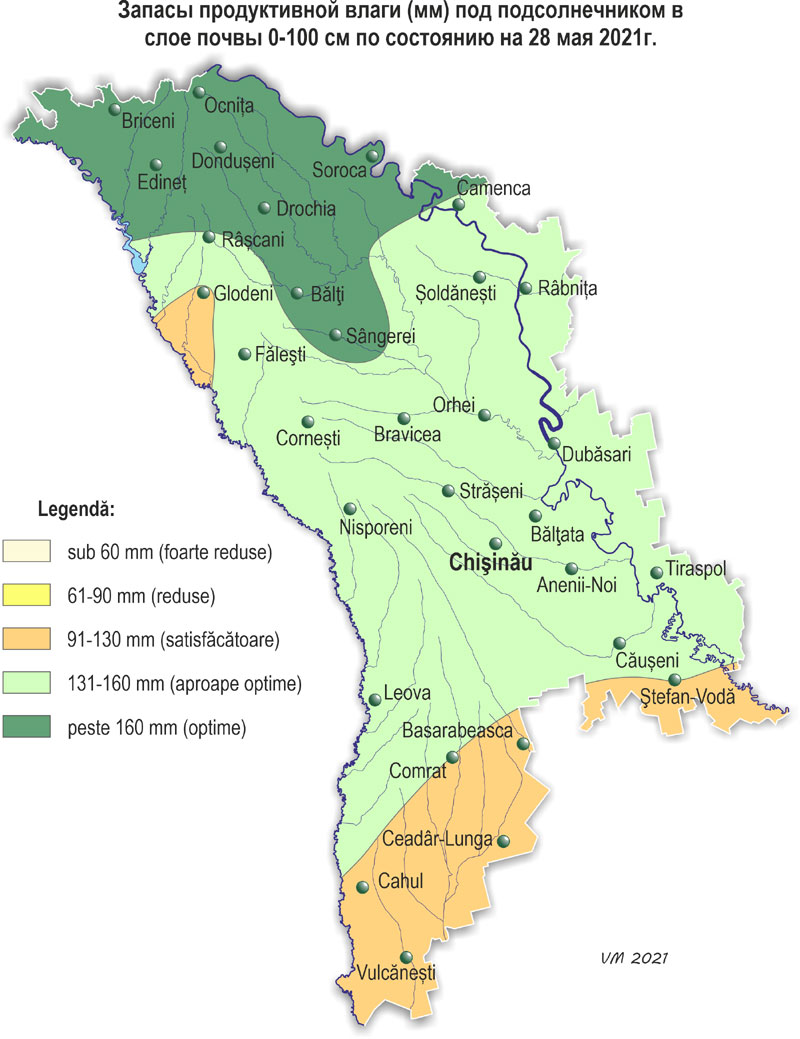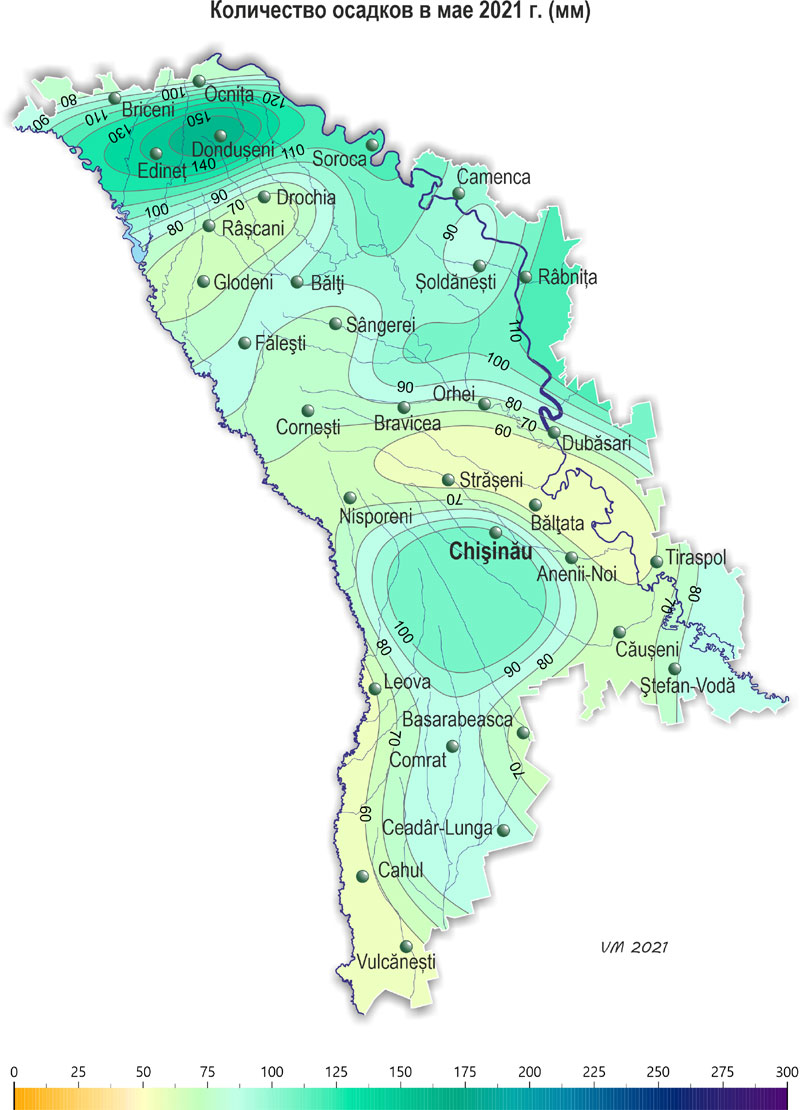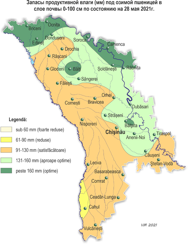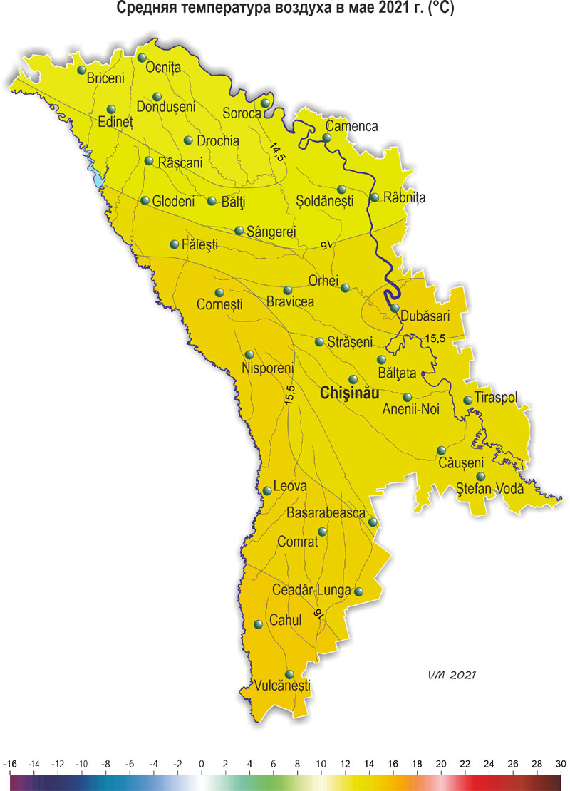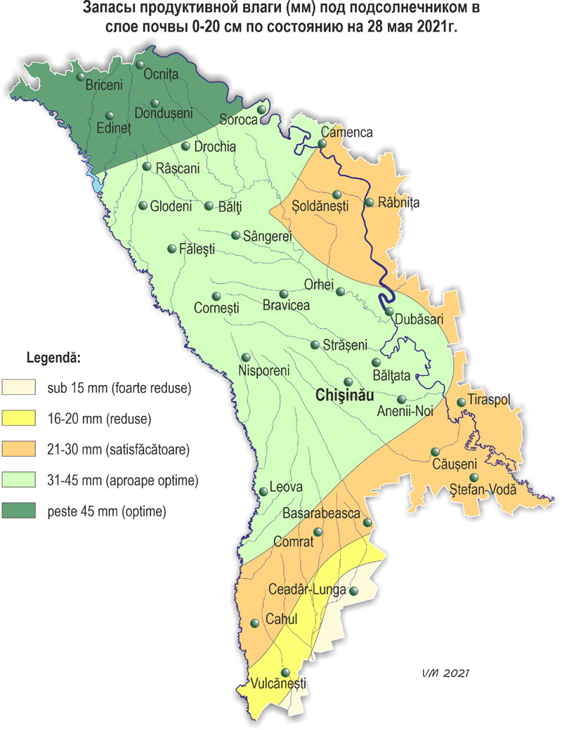 В течение мая наблюдалась неоднородная по температурному режиму c осадками погода. Средняя за месяц температура воздуха на большей части территории республики была на 0,5-1,0ºС ниже нормы, местами - близка к норме и составляла +14,0..+16,5ºС. Максимальная температура воздуха в мае повышалась по территории до +29ºС (МС Кахул). Число дней с максимальной температурой воздуха +25ºС и выше за месяц составило по территории в основном 1-5 дней при норме 6-11 дней. Минимальная температура воздуха понижалась до +0,3ºС (МС Кодрий). Заморозки на поверхности почвы интенсивностью до -1ºС были зарегистрированы местами по территории 9 мая. На высоте 2 см от поверхности почвы заморозки интенсивностью -1..-5ºС отмечались 4, 9 и 10 мая. Заморозки в этот период такой интенсивности возможны в среднем один раз в 10-30 лет. Сумма осадков за месяц на 80% территории составляла 50-90 мм (100-170% нормы), на остальной территории их количество достигало 100-160 мм (185-265% нормы). Количество осадков по регионам составляло: - в северных районах республики в основном 65-90 мм (105-170% нормы); местами – 105-165 мм (185-265% нормы); - в центральных районах -55-100 мм (110-195% нормы); - в южных районах - 50-85 мм (100-170% нормы). Погодные условия в мае были в основном удовлетворительными для роста и развития сельскохозяйственных культур на большей части территории республики. Дождливая погода и повышенная влажность воздуха, создавали не вполне благоприятные условия для созревания черешни и способствовали развитию болезней у сельскохозяйственных культур. Прошедшие в течение месяца сильные дожди, местами с градом, вызвали повреждения сельскохозяйственных культур и народнохозяйственных объектов. У озимых культур в течение мая отмечались фазы: появление нижнего стеблевого узла соломины, колошение и цветение. Высота растений к концу месяца равнялась в основном 45-75 см, местами 80-100 см. По состоянию на 28 мая запасы продуктивной влаги под озимыми культурами в полуметровом слое почвы составляли: в северных районах – 55-125 мм (150-250% нормы); в центральных – 60-80 мм (125-190% нормы); в южных – 40-65 мм (85-135% нормы). Запасы продуктивной влаги в метровом слое почвы составляли: в северных районах – 105-190 мм (130-185% нормы); в центральных районах – 120-160 мм (125-180% нормы); в южных районах – 90-135 мм (95-125% нормы). На посевах ярового ячменя в первой половине месяца отмечался выход в трубку, во второй половине – появление нижнего стеблевого узла соломины. У гороха в течение месяца отмелось появление 3-го листа, к концу мая – появление соцветий. У сахарной свеклы продолжалось развитие очередных листьев, к концу мая отмечалось появление третьего и пятого настоящих листьев, на ранних посевах начался рост корнеплода. Многие хозяйства в начале месяца проводили сев кукурузы. Во второй декаде мая у кукурузы отмечалось прорастание зерна и всходы, к концу мая сформировался третий и пятый лист, местами в южных районах - седьмой и девятый лист. Высота растений равнялась в основном 5-20 см, местами 30-40 см. По состоянию на 28 мая запасы продуктивной влаги под кукурузой в пахотном слое почвы составляли: в северных районах – 35-60 мм (125-185% нормы); в центральных – 20-35 мм (80-140% нормы); в южных – 20-30 мм (85-100% нормы). Запасы продуктивной влаги в метровом слое почвы составляли: в северных районах – 140-205 мм (125-160% нормы); в центральных районах - 130-165 мм (100-120% нормы), в южных районах –100-160 мм (90-130% нормы). У подс