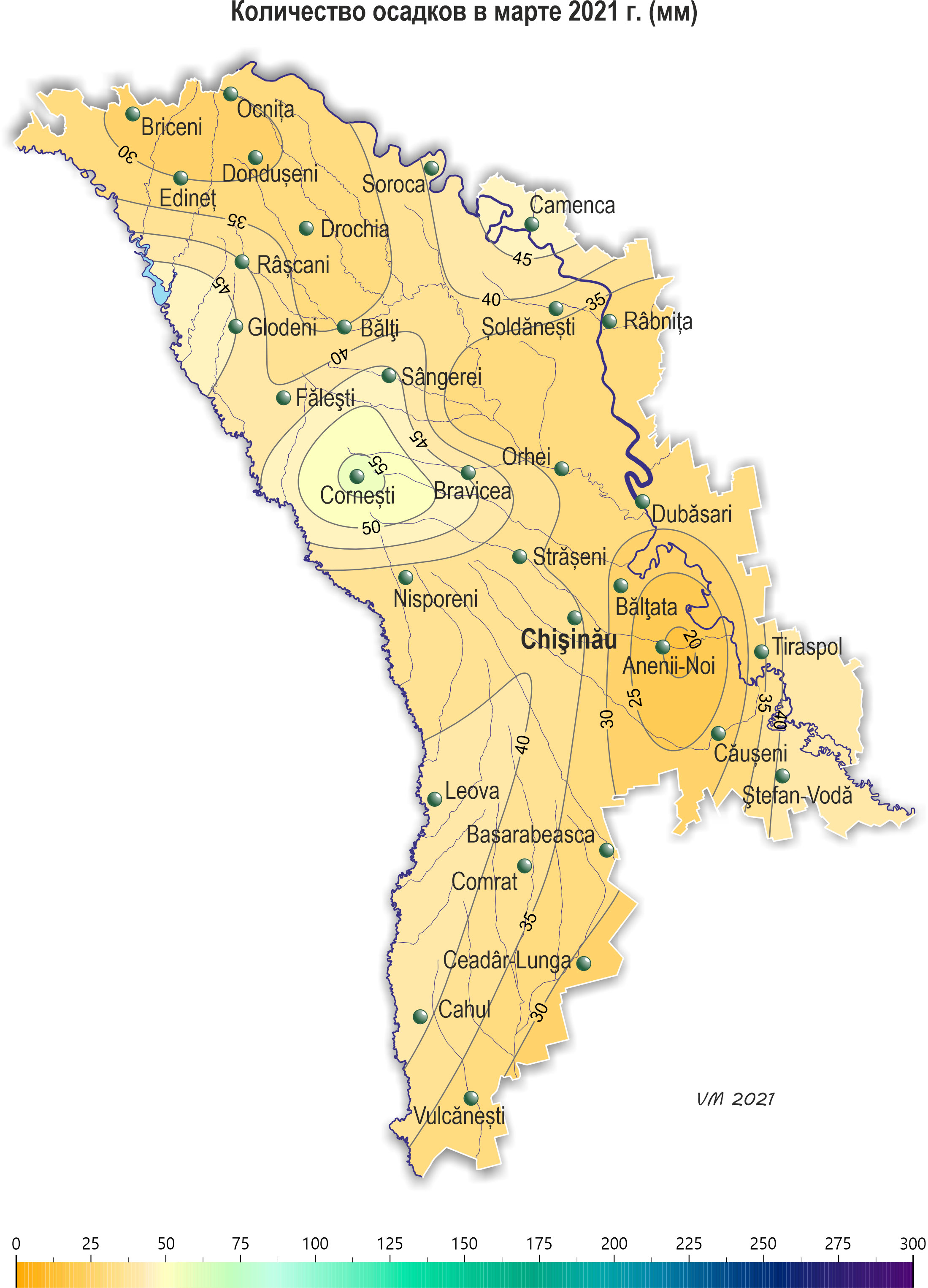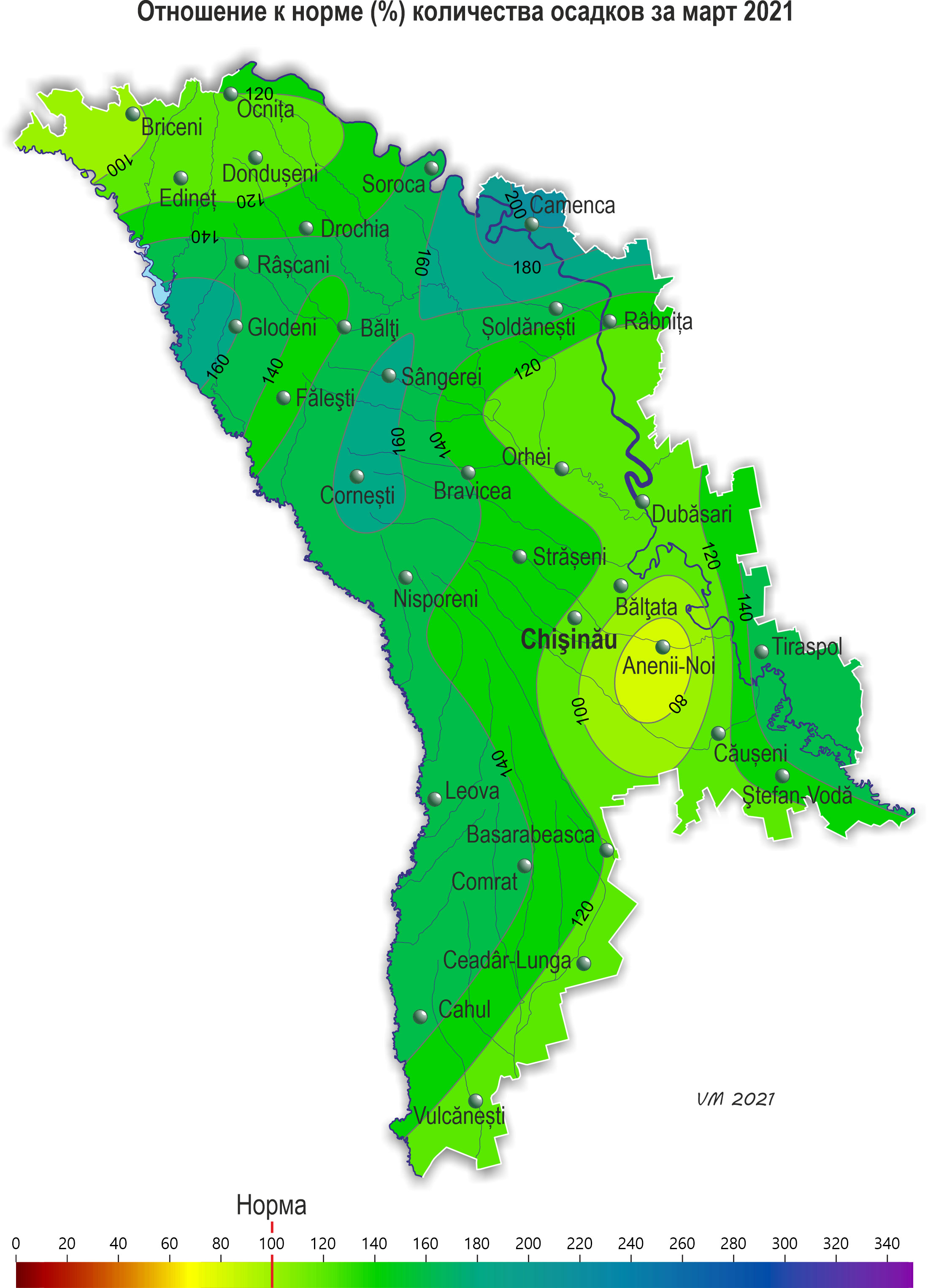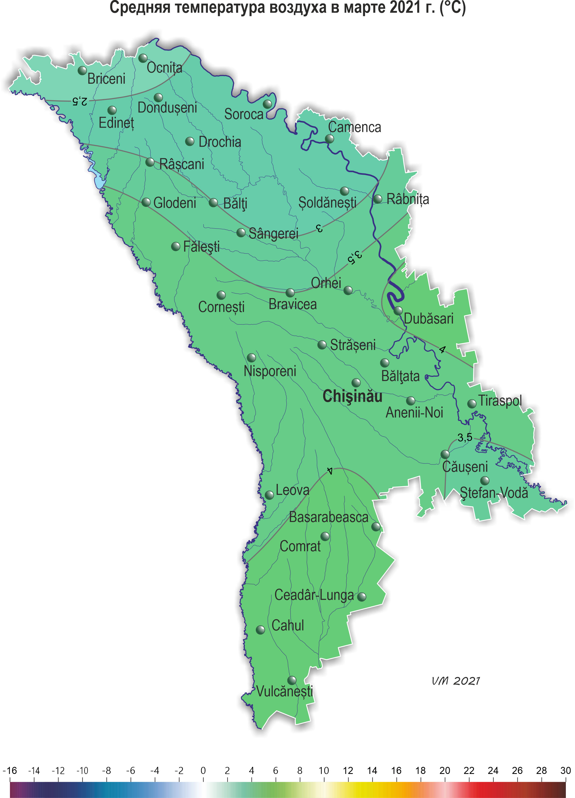 В течение марта на территории республики наблюдалась теплее обычного, с осадками погода. Средняя за месяц температура воздуха на территории республики была на 0,7-1,3°С выше нормы и составляла +2,2..+4,3°С. Максимальная температура воздуха в марте на территории республики повышалась до +20ºС (метеорологическая станция Чадыр-Лунга). Минимальная температура воздуха понижалась до -9ºС (метеорологические станции Кодрий, Бэлцата, Тираспол). Устойчивый переход средней суточной температуры воздуха через +5°С произошел 26-27 марта, что в северных районах на неделю раньше, на остальной территории в сроки близкие к обычным. Количество осадков по регионам составило: - в северных районах республики 29-48 мм (100-200% нормы); - в центральных районах в основном 28-56 мм (110-165% нормы), местами (Анений-Ной) -20 мм (70% нормы); - в южных районах 27-43 мм (110-160% нормы). В отдельные дни месяца (1, 6, 13 и 24 марта) местами наблюдался снежный покров. Его высота на метеорологических площадках составила 1-4 см. Погодные условия в марте были удовлетворительными для роста и развития озимых культур. В первой половине месяца на большей части территории республики у озимых культур отмечалось кущение, местами - третий лист. Во второй половине месяца повсеместно продолжалось кущение. Высота растений на конец месяца составляла 10-20 см. На раскустившихся растениях сформировалось в среднем 1-3 стебля. По состоянию на 28 марта запасы продуктивной влаги под озимыми культурами в пахотном слое почвы составляли: в северных районах 25-50 мм (80-160% нормы); в центральных 30-45 мм (90-130% нормы); в южных 25-40 мм (75-115% нормы). Запасы продуктивной влаги в метровом слое почвы составляли: в северных районах в основном 115-200 мм (80-145% нормы); в центральных районах 145-180 мм (85-120% нормы); в южных районах 135-195 мм (90-130% нормы). Многолетние насаждения в течение месяца на большей части территории республики находились в состоянии вегетационного покоя, лишь в крайних южных районах во второй половине марта у ранних сортов вишни и черешни отмечалось набухание почек, у ранних сортов абрикоса – распускание почек. К концу месяца у плодовых культур отмечалось набухание почек, в южных районах республики у ранних сортов абрикоса, черешни, вишни отмечалось распускание почек и развертывание первых листьев, у винограда местами началось сокодвижение. По состоянию на 28 марта запасы продуктивной влаги под многолетними насаждениями в метровом слое почвы составляли: в северных районах 140-150 мм (90-100% нормы); в центральных районах 150-220 мм (105-160% нормы); в южных районах 145-220 мм (115-160% нормы). В конце месяца отдельные хозяйства республики приступили к севу ранних яровых культур. Средняя температура почвы на глубине 10 см за месяц составила +3..+6ºС.