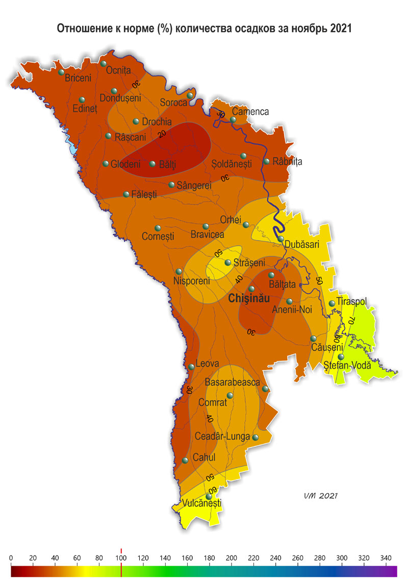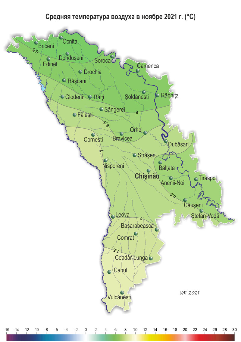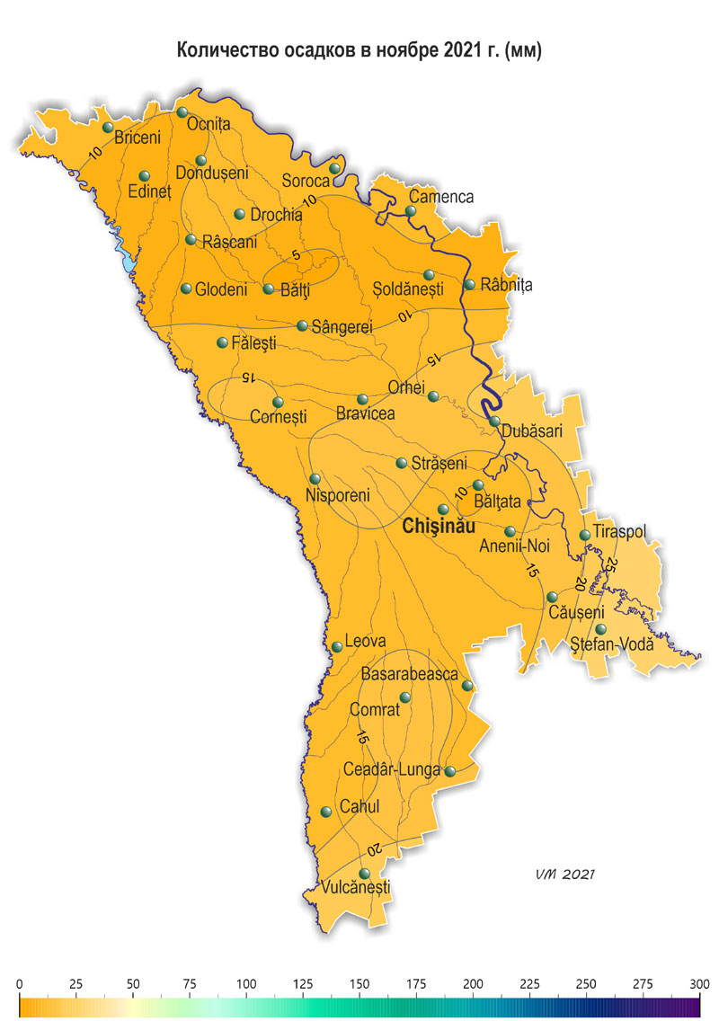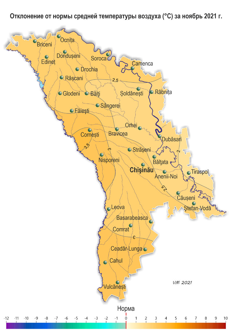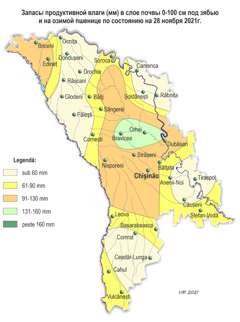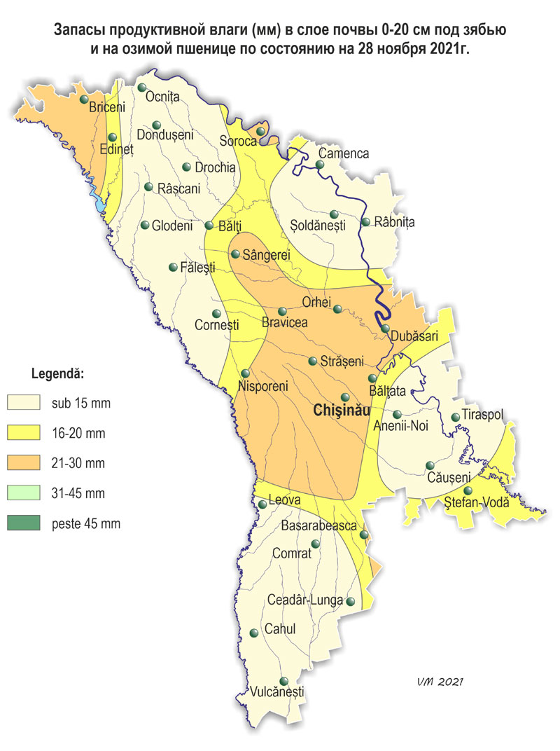 В ноябре на территории республики наблюдалась неоднородная по температурному режиму с дефицитом осадков погода. Средняя за месяц температура воздуха была выше нормы на 2,0-3,5ºС и составляла +5,5..+8,0ºС, что отмечается в среднем один раз в 3-7 лет. Максимальная температура воздуха повышалась до +25ºС (метеорологическая станция Чадыр-Лунга). Минимальная температура воздуха понижалась до -10ºС (метеорологические станции Бэлцата, Тираспол). Сумма осадков за ноябрь составила 5-28 мм (15-70% нормы). Количество осадков по регионам составило: в северных районах – 5-15 мм (15-35% нормы), в центральных районах – 10-20 мм (25-55% нормы), в южных районах – 10-28 мм (30-70% нормы). В ноябре из-за дефицита осадков и низких запасов продуктивной влаги в почве сохранялись неблагоприятные погодные условия для проведения сева, роста и развития озимых культур. В начале ноября у озимой пшеницы на большей части посевов отмечались фазы прорастания зерна и всходы, местами – третий лист, отдельные хозяйства продолжали сев озимых культур. Дефицит осадков и низкие запасы продуктивной влаги в почве сдерживали в течение ноября появление всходов, рост и развитие озимой пшеницы. К концу месяца на большей части посевов у озимой пшеницы отмечались фазы всходы и третий лист, местами - прорастание зерна. На ранних посевах, преимущественно в северной половине республики, у озимой пшеницы отмечалось кущение. Развитие озимых культур в этом году проходит в основном на 1-1,5 месяца позже обычных сроков. По состоянию на 28 ноября запасы продуктивной влаги на посевах озимой пшеницы и под зябью в пахотном слое почвы составляли: в северных районах – в основном 5-15 мм (15-65% нормы), местами – 20-30 мм (75-105% нормы); в центральных – в основном 15-20 мм (45-65% нормы), местами – 25-30 мм (75-90% нормы); в южных – 15-20 мм (45-70% нормы), местами – 5-10 мм (15-40% нормы). Запасы продуктивной влаги в метровом слое почвы составляли: в северных районах – в основном 25-75 мм (25-65% нормы), местами – 80-125 мм (75-100% нормы); в центральных районах 70-125 мм (75-130% нормы); в южных районах – в основном 40-70 мм (40-55% нормы), местами – 75-85 мм (75-80% нормы). У плодовых культур и винограда в течение ноября отмечался листопад. Условия для вызревания древесины многолетних насаждений и лозы винограда были в основном удовлетворительными. По состоянию на 28 ноября запасы продуктивной влаги под многолетними насаждениями в метровом слое почвы составляли: в северных районах – 60-65 мм (50-60% нормы); в центральных районах – в основном 40-60 мм (45-60% нормы), местами – 115-125 мм (105-130% нормы); в южных районах – в основном 35-50 мм (40-50% нормы), местами – 80-90 мм (75-80% нормы).
