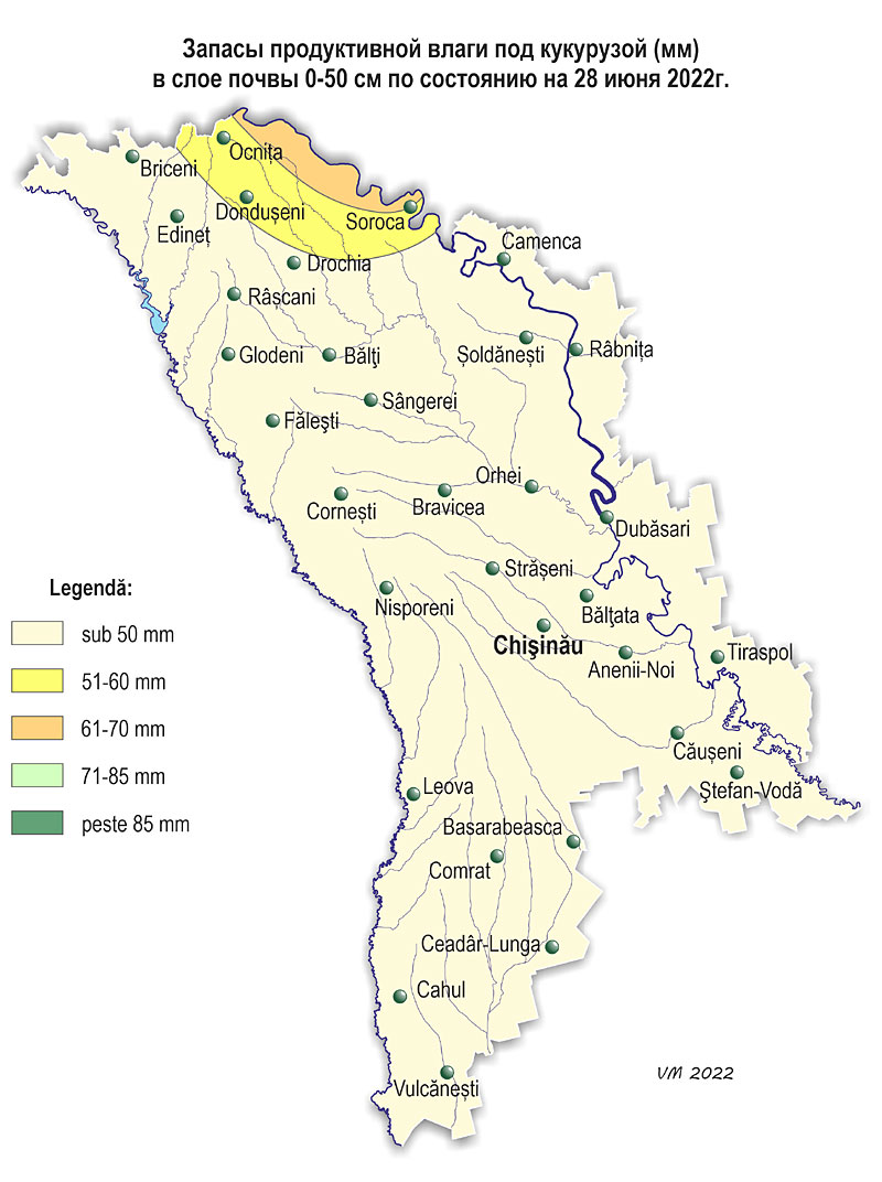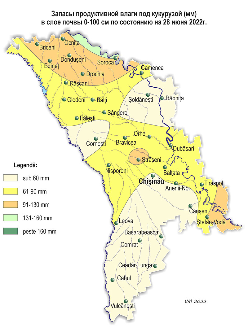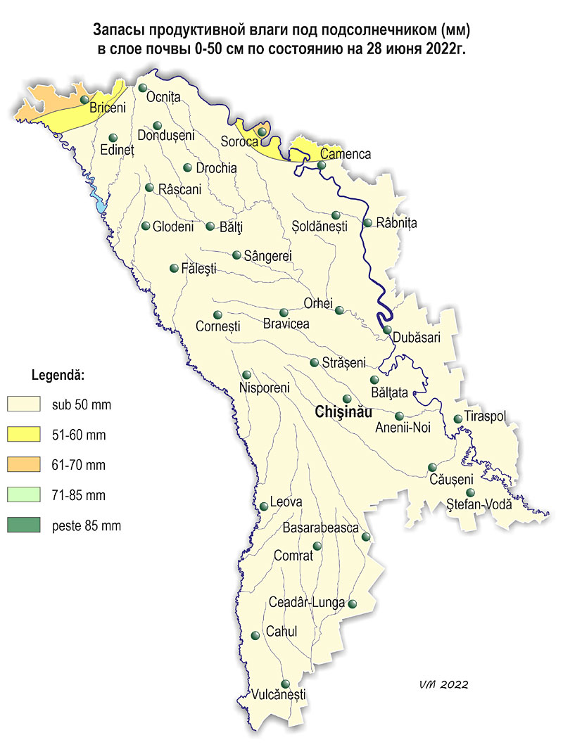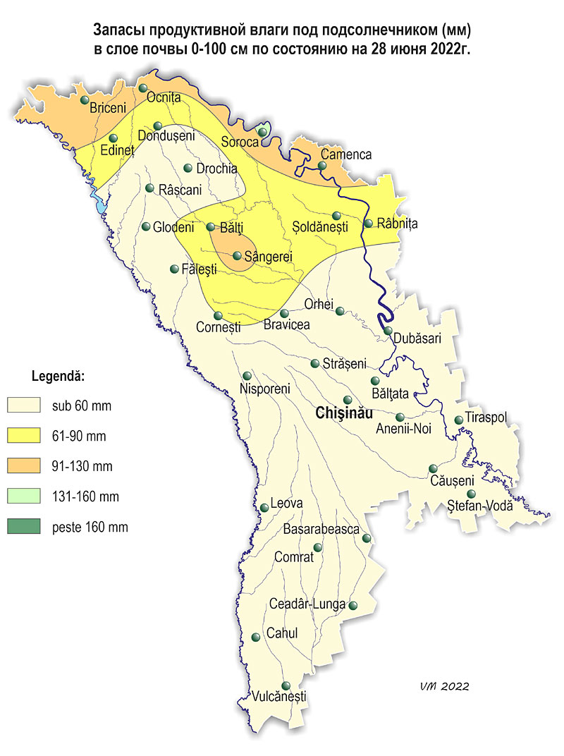 2. Запасы влаги в почве По состоянию на 28 июня, запасы продуктивной влаги в почве под кукурузой в полуметровом слое почвы составляли: - в северных районах: в северных районах: в основном 10-30 мм (10-50% нормы), местами – 40-60 мм (70-110% нормы); - в центральных: 10-40 мм (20-65% нормы); - в южных: 10-35 мм (20-70% нормы). Запасы продуктивной влаги в метровом слое почвы под кукурузой составляли: - в северных районах: в основном 40-65 мм (35-65% нормы), местами – 100-130 мм (90-110% нормы); - в центральных районах: в основном 50-75 мм (45-55% нормы), местами – 85-95 мм (70-80% нормы); - в южных районах: в основном 30-55 мм (25-40% нормы), местами – 60-95 мм (70-90% нормы). Содержание влаги в полуметровом слое почвы и на глубине 1 м на посевах кукурузы в большинстве регионов страны было низким. По состоянию на 28 июня запасы продуктивной влаги под подсолнечником в полуметровом слое почвы составляли: - в северных районах: в основном 10-30 мм (20-60% нормы), местами – 40-65 мм (80-120% нормы); - в центральных: 10-25 мм (20-50% нормы); - в южных: 10-20 мм (20-40% нормы). Запасы продуктивной влаги в метровом слое почвы под подсолнечником составляли: - в северных районах: в основном 65-140 мм (80-125% нормы), местами – 35-55 мм (45-60% нормы); - в центральных районах: 35-65 мм (45-70% нормы); - в южных районах: 20-45 мм (25-40% нормы). Содержание влаги в полуметровом слое почвы и на глубине 1 м на посевах подсолнечника было в основном низким. По состоянию на 28 июня запасы продуктивной влаги в почве под многолетними насаждениями в метровом слое почвы составляли: - в северных и центральных районах: в основном 50-80 мм (45-65% нормы), местами – 100-120 мм (90-100% нормы); - в южных районах: в южных районах: 20-75 мм (20-70% нормы). Содержание влаги в почвенном слое на глубине 1 м под многолетними насаждениями было в основном низким.