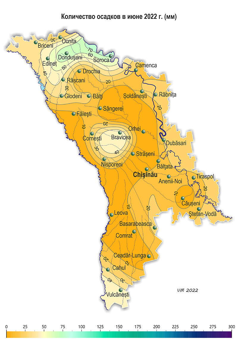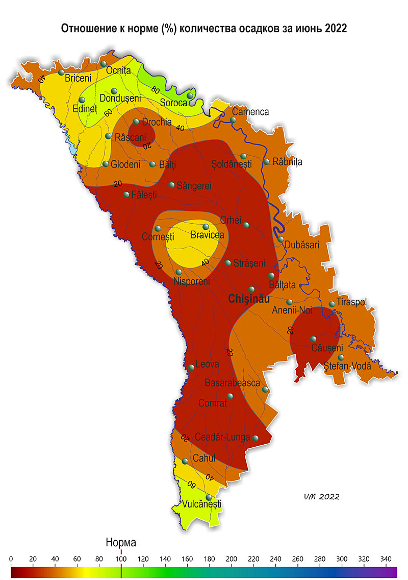 3. Вероятностный метеорологический прогноз на июль 2022 года для территории Республики Молдова. В результате анализа синоптических и климатических материалов, проведенного Государственной Гидрометеорологической Службой, в июле на территории республики ожидается следующий режим температуры воздуха и осадков: - среднемесячная температура воздуха прогнозируется выше нормы (норма +19..+22ºС); - количество осадков ожидается ниже нормы (норма 55-90 мм).