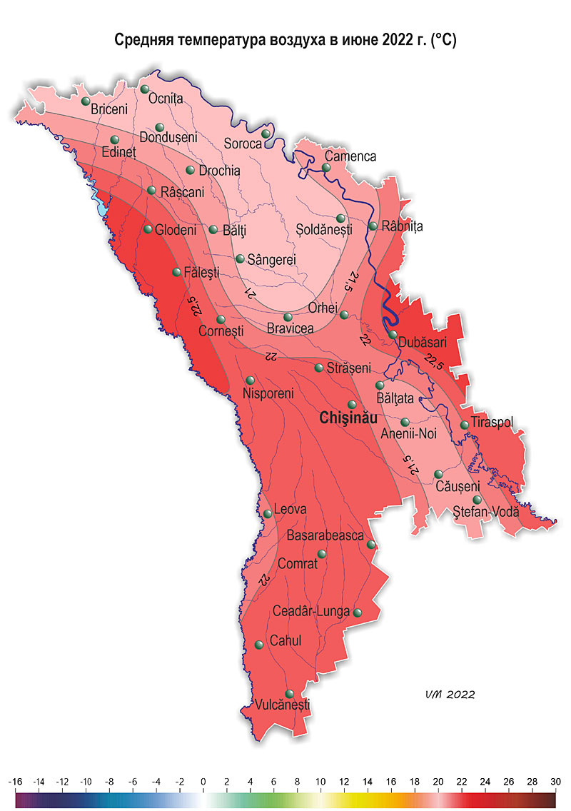 1. Термический режим В течение июня на территории республики наблюдалась жаркая с существенным дефицитом осадков погода. Средняя за месяц температура воздуха была на 2,0-3,5ºС выше нормы и составляла +20,5..+22,5ºС, что отмечается в среднем один раз в 5-10 лет. Максимальная температура воздуха повышалась до +36ºС. Число дней с максимальной температурой воздуха ≥30ºС составило по территории 5-13 дней (норма 2-6). Максимальная температура воздуха ≥35ºС отмечалась на большей части территории в течение 1-2 дней (норма - 1 день). Минимальная температура воздуха понижалась до +8ºС (метеорологическая станция Каменка). Режим осадков Сумма осадков за месяц на 95% территории составляла в основном 3-30 мм (5-40% нормы), в отдельных пунктах (5% территории) выпало 45-70 мм (60-95% нормы). По регионам страны осадки распределились следующим образом: - Север – в основном 6-30 мм (10-40% нормы), местами – 50-70 мм (60-95% нормы); - Центр – 5-25 мм (10-30% нормы); - Юг – в основном 3-20 мм (5-30% нормы), местами – 30-45 мм (40-65% нормы). 2. Другие метеорологические параметры В отдельные дни месяца отмечались грозы, усиление скорости ветра до 23 м/с (метеорологическая станция Сорока). В районе метеорологической станции Кахул 21 июня отмечался град диаметром 8 мм.