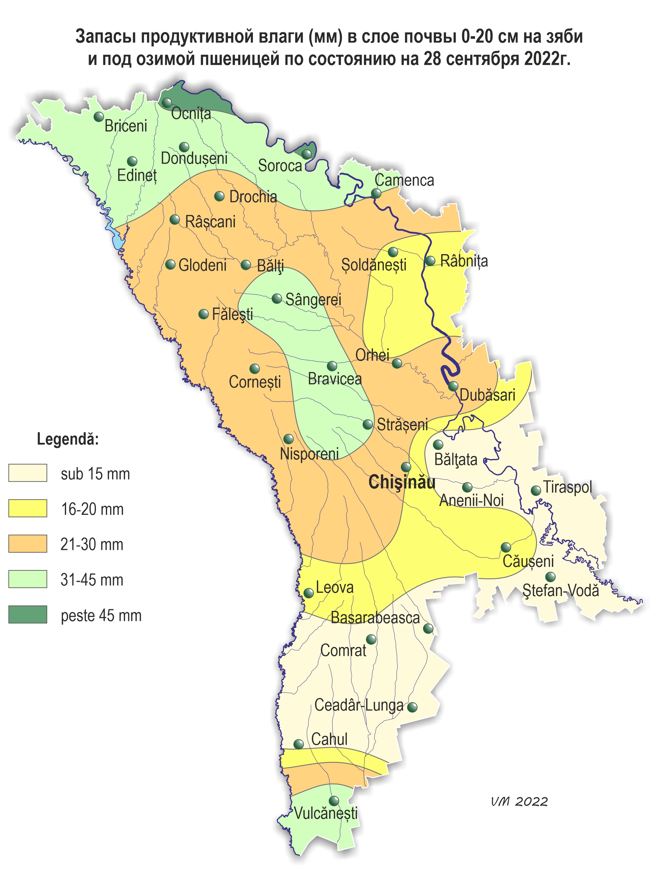 Содержание влаги в пахотном и метровом слое почвы под зябью и озимой пшеницей в большинстве регионов страны было достаточным, в отдельных, преимущественно южных районах, – низким. По состоянию на 28 сентября запасы продуктивной влаги в почве под многолетними насаждениями в метровом слое почвы составляли: – в северных и центральных районах: в основном – 70-105 мм (75-155% нормы), местами – 15-55 мм (25-65% нормы); – в южных районах: в основном 50-95 мм (80-155% нормы), местами – 10-45 мм (30-60% нормы). Содержание влаги в почвенном слое на глубине 1м под многолетними насаждениями было в основном удовлетворительным, местами – низким. 2. Агрометеорологический прогноз на октябрь 2022 (по многолетним данным). Прогнозируемый термический режим на октябрь будет в основном благоприятным для проведения сева, а также для роста и развития озимых культур. Количество осадков в пределах многолетней нормы будет способствовать накопление запасов влаги в почве. Озимые культуры. Хозяйства страны будут проводить массовый сев озимых культур. У озимой пшеницы, посеянной в сентябре, в первой половине октября будет отмечаться фаза третьего листа, во второй половине октября – кущение. Яровые культуры. У сахарной свеклы завершиться сбор урожая. Плодовые культуры и виноград. У плодовых культур и винограда завершиться сбор урожая, во второй половине месяца будет отмечаться листопад.
