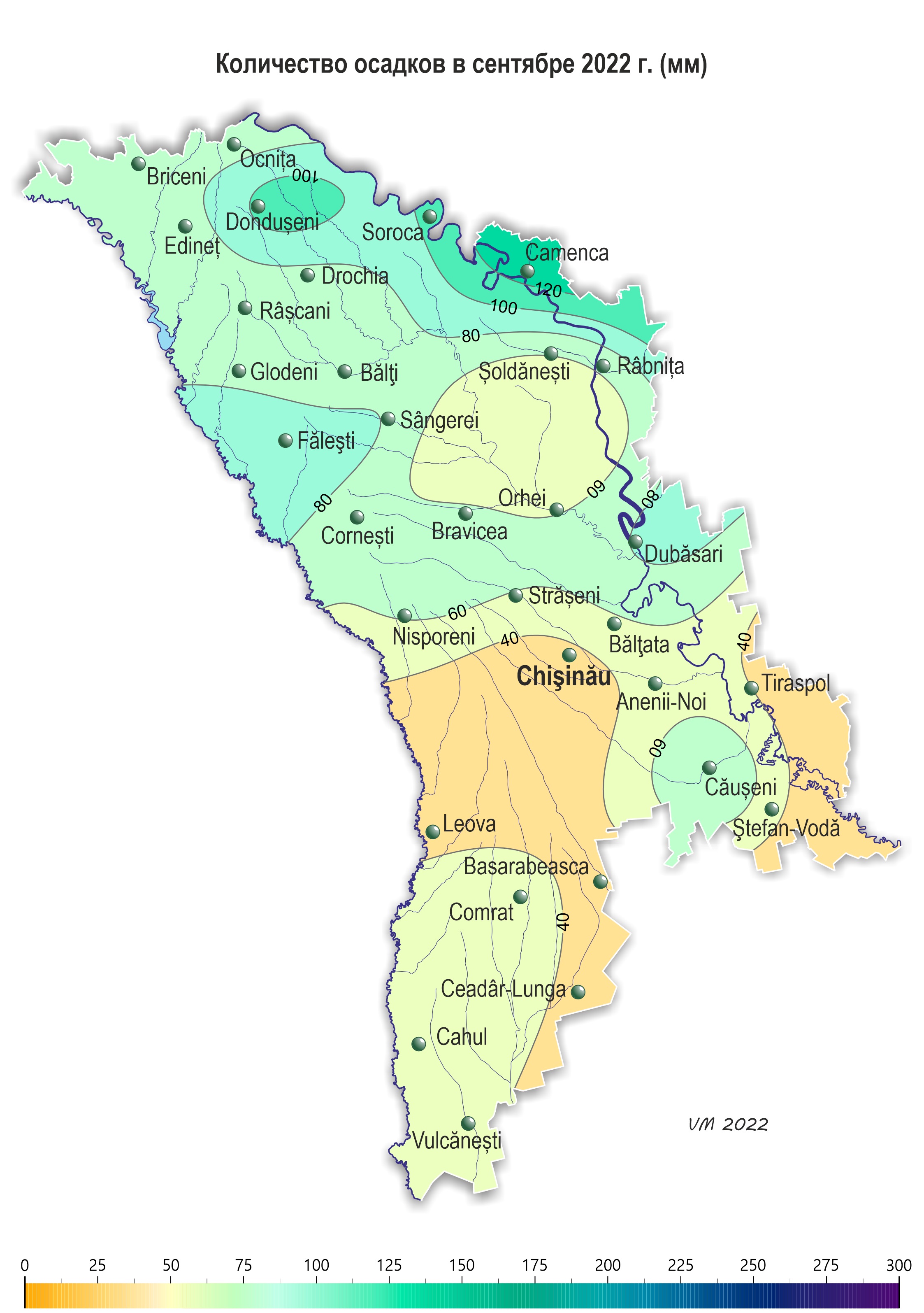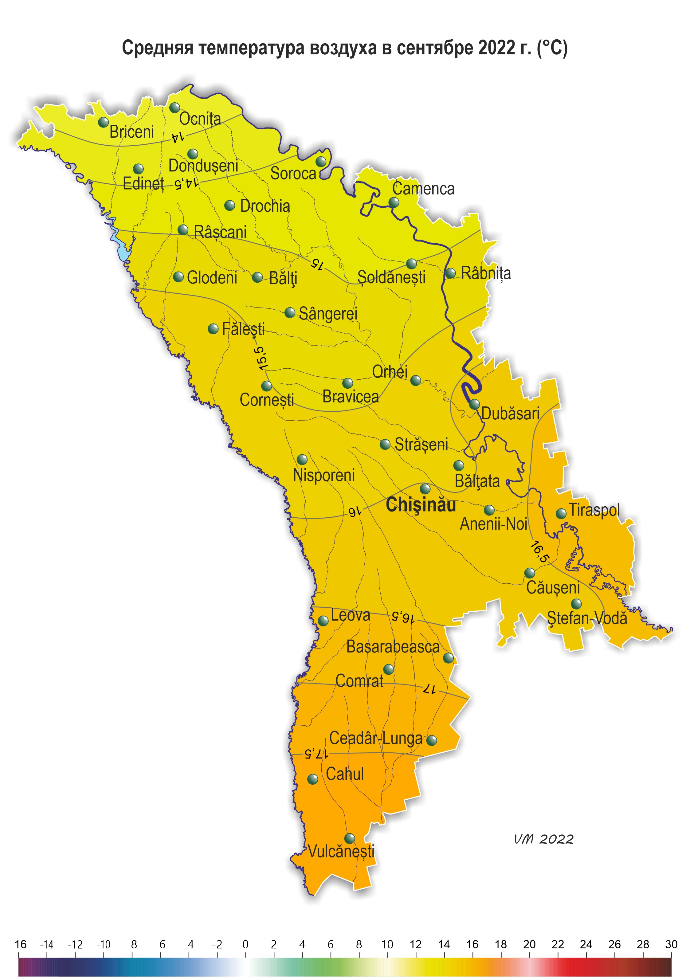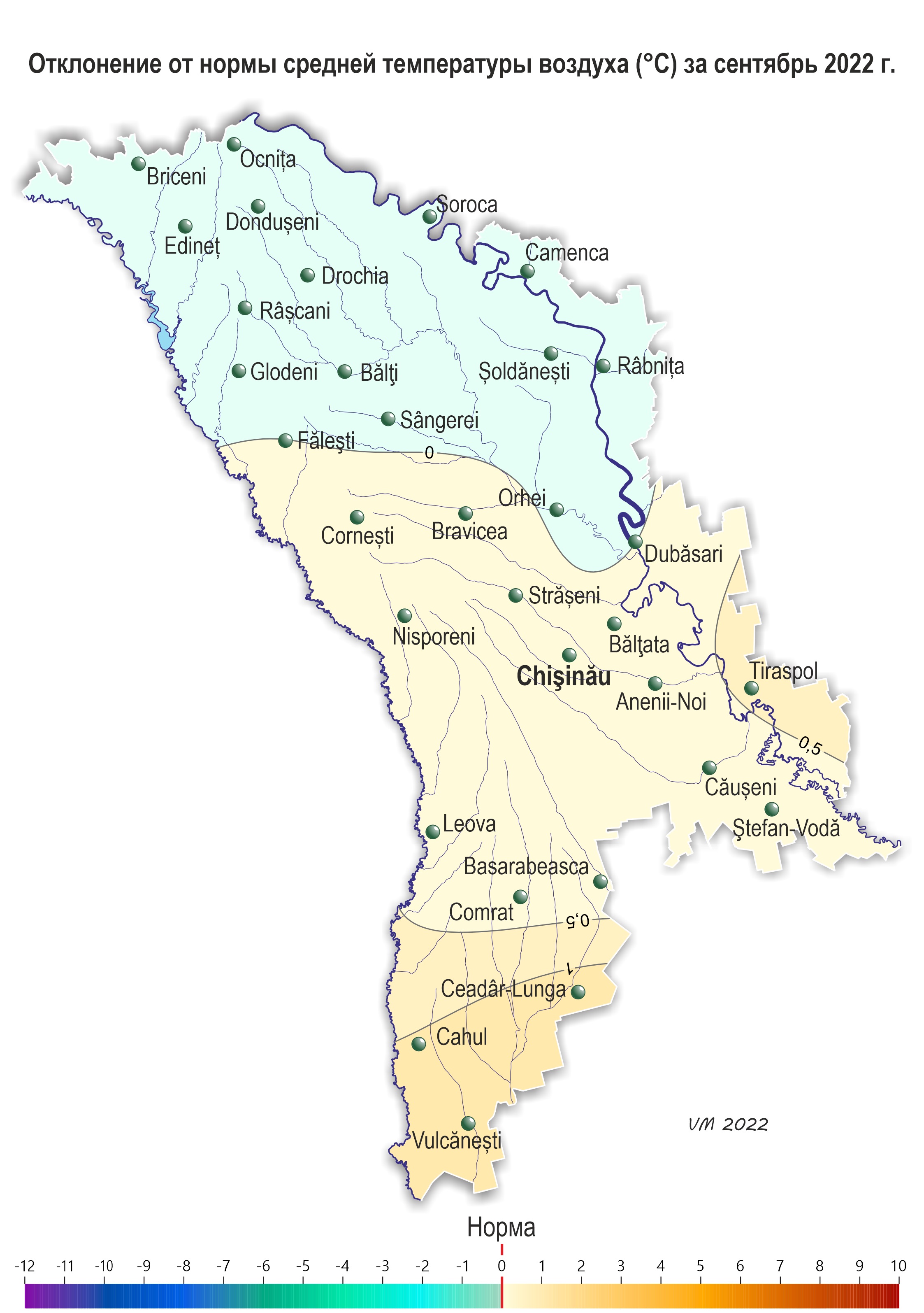 3. Другие метеорологические параметры В отдельные дни месяца отмечались грозы, а также усиление скорости ветра до 15-21 м/с . 29 сентября в районах Анений-Ной и Кэушень отмечался град. 4. Вероятностный метеорологический прогноз на октябрь 2022 года для территории Республики Молдова. В результате анализа синоптических и климатических материалов, проведенного Государственной Гидрометеорологической Службой, в октябре на территории республики ожидается следующий режим температуры воздуха и осадков: