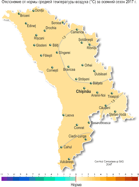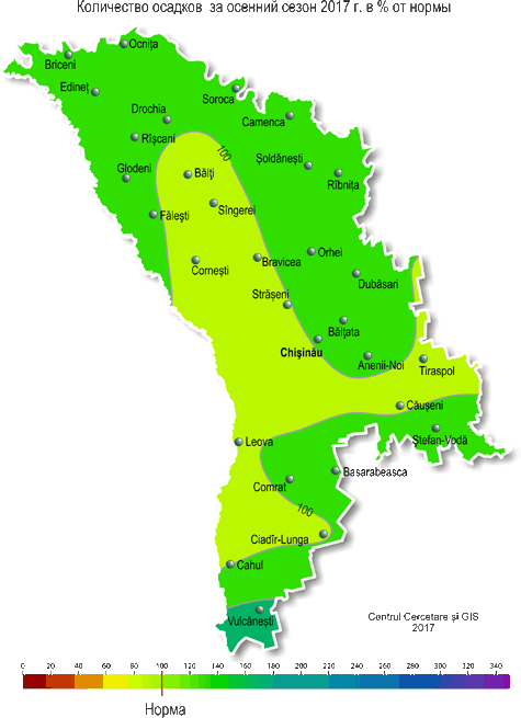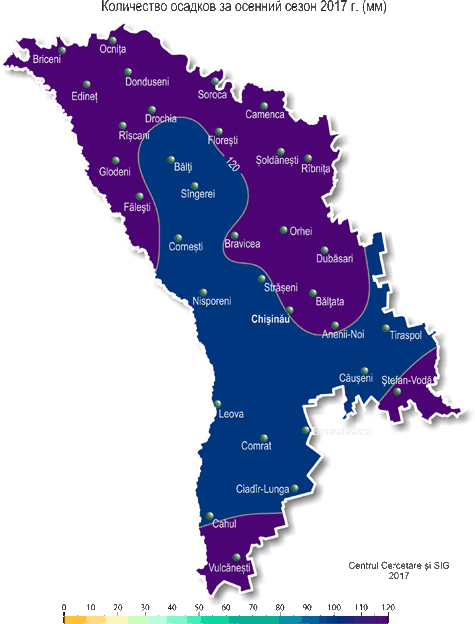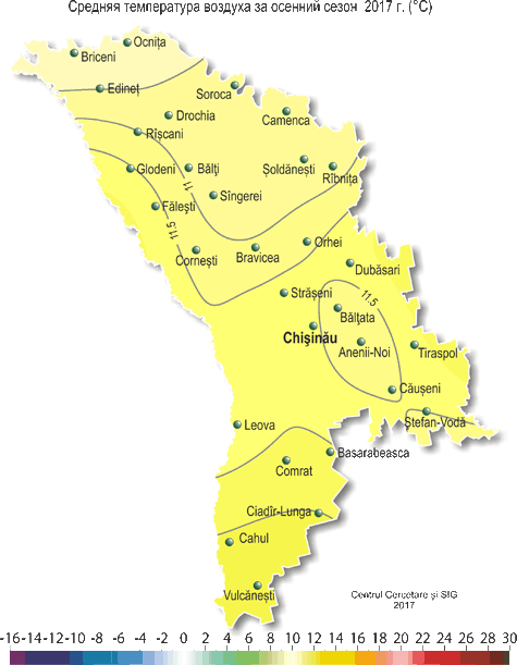 Особенно много осадков выпало в октябре, когда их сумма за месяц составила по территории 30-90 мм (100-300% месячной нормы). Первый снежный покров отмечался 27 ноября местами в северных районах республики, но его высота на метеорологических площадках не превысила 1см. В течение сезона наблюдалось стихийное метеорологическое явление в виде сильного дождя: 22 сентября на АМП Вулкэнешть за 3 ч выпало 65 мм осадков. Также отмечались туманы, грозы, усиление скорости ветра до 21 м/с (МС Сорока, Корнешть). По сравнению с осенью 2016 г. этот сезон был на 1-2ºC теплее и местами с меньшим количеством осадков (на 30-100 мм). Годом аналогом по температурному режиму является 2015 г. По данным агрометеорологических наблюдений погодные условия осени были в основном удовлетворительными для созревания овощей, фруктов и винограда. Из-за низких запасов продуктивной влаги в почве сложились неблагоприятные условия для подготовки почвы и проведения сева озимых культур в оптимальные сроки на большей части территории республики. К севу озимых культур отдельные сельскохозяйственные производители приступили в третьей декаде сентября. Массовый сев проводился в октябре. По состоянию на 28 сентября запасы продуктивной влаги под зябью (на стерне) в северной половине республики в пахотном слое почвы составляли в основном 20-40 мм (85-165% нормы), преимущественно в южной половине запасы продуктивной влаги были низкими и составляли в основном 2-15 мм (10-65% нормы), или местами отсутствовали. В метровом слое почвы на 60% территории запасы продуктивной влаги в почве составляли в основном 15-60 мм (20-65% нормы), на остальной территории, преимущественно в северной половине – 70-150 мм (75-150% нормы). В течение сентября в хозяйствах республики собирали урожай подсолнечника, кукурузы, сахарной свеклы, овощных, плодовых культур и винограда. Отдельные хозяйства на севере республики в третьей декаде сентября начали сев озимых культур. Заморозки в воздухе и на поверхности почвы, отмечавшиеся в конце месяца, создавали угрозу повреждения неубранного урожая овощных культур. По состоянию на 28 сентября запасы продуктивной влаги под многолетними насаждениями в метровом слое почвы составляли в основном 35-45 мм (45-60% нормы), местами, преимущественно в северных районах – 65-125 мм (70-115% нормы). Погодные условия большую часть октября были в основном благоприятными для завершения уборки урожая поздних сельскохозяйственных культур, а также для продолжения сева озимых культур и их роста и развития. На посевах озимой пшеницы в течение октября отмечались фазы: прорастание зерна и всходы. К концу месяца на ранних посевах сформировался третий лист. Отдельные хозяйства продолжали сев озимых культур. Развитие озимых культур из-за поздних сроков сева проходило в основном на месяц позже обычного. По состоянию на 28 октября запасы продуктивной влаги под озимыми культурами в пахотном слое почвы составляли 20-45 мм (80-160% нормы), в метровом слое почвы они равнялись в основном 85-160 мм (80-165% нормы), местами - 40-70 мм (45-65% нормы). В течение октября хозяйства республики завершали сбор урожая плодовых, овощных культур, винограда и сахарной свеклы. Во второй половине октября у плодовых культур и винограда отмечался листопад в сроки, близкие к обычным. Условия для вызревания древесины многолетних насаждений и лозы винограда в течение месяца были