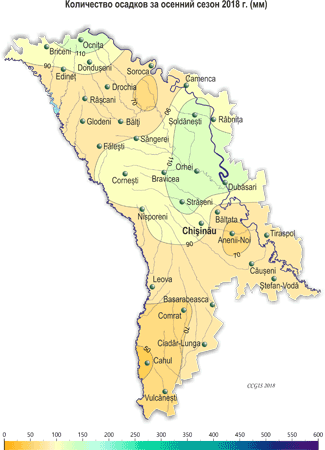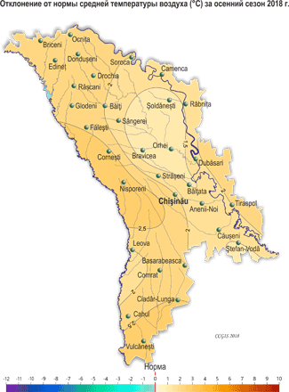 Значительный недобор осадков наблюдался в октябре, когда их сумма за месяц на большей части территории не превысила 1-10 мм (5-35% месячной нормы), что отмечается в среднем один раз в 5-10 лет. Первый снежный покров установился по территории 17-20 ноября и в северной половине республики сохранялся до конца месяца. Его высота на метеорологических площадках достигала 21см (МС Бравича). В течение сезона наблюдалось стихийное метеорологическое явление в виде отложения мокрого снега диаметром до 51 мм (20 ноября, МС Бравича). Также отмечались туманы, грозы, гололедно-изморозевые отложения диаметром 5-24 мм (ноябрь), усиление скорости ветра до 22 м/с (ноябрь, МС Чадыр-Лунга), гололедица на дорогах. По сравнению с осенью 2017 г. этот сезон был аналогичным по среднему температурному режиму и с меньшим количеством осадков (на 30-80 мм). По данным агрометеорологических наблюдений погодные условия осени были в основном благоприятными для созревания овощей, фруктов и винограда. Из-за отсутствия существенных осадков и низких запасов продуктивной влаги в пахотном слое почвы большую часть осени отмечались в основном не благоприятные условия для проведения сева, появления всходов, а также для роста и развития озимых культур. К севу озимых культур отдельные сельскохозяйственные производители приступили в третьей декаде сентября. Массовый сев проводился в октябре. По состоянию на 28 сентября запасы продуктивной влаги под зябью на 60% территории составляли в пахотном слое почвы 5-12 мм (15-55% нормы), на остальной территории – 15-25 мм (75-105% нормы). В метровом слое почвы на 60% территории запасы продуктивной влаги составляли 35-70 мм (40-65% нормы), на остальной – 75-110 мм (80-115% нормы). В течение сентября в хозяйствах республики собирали урожай подсолнечника, кукурузы, сахарной свеклы, овощных, плодовых культур и винограда. Заморозки в воздухе и на поверхности почвы создавали угрозу повреждения неубранного урожая овощных культур. Отдельные хозяйства, где запасы влаги в почве были удовлетворительными, проводили сев озимых культур. По состоянию на 28 сентября запасы продуктивной влаги под многолетними насаждениями в метровом слое составляли в основном 35-60 мм (45-65% нормы), местами – 60-80 мм (75-115% нормы). Погодные условия в течение октября были в основном благоприятными для завершения уборки урожая поздних сельскохозяйственных культур. Однако из-за отсутствия существенных осадков и низких запасов продуктивной влаги в пахотном слое почвы сохранялись не вполне благоприятные условия для проведения сева, появления всходов, а также для роста и развития озимых культур на большей части территории республики. На посевах озимой пшеницы большую часть октября отмечались фазы: прорастание зерна и всходы. К концу месяца на ранних посевах сформировался третий лист, местами отмечалось кущение. Отдельные хозяйства продолжали сев озимых культур. По состоянию на 28 октября запасы продуктивной влаги под озимыми культурами в пахотном слое почвы составляли в основном 1-13 мм (5-55% нормы), местами, преимущественно в северной половине республики, – 15-25 мм (70-100% нормы). В метровом слое почвы запасы продуктивной влаги на 70% территории составляли 15-65 мм (15-70% нормы), на остальной территории – 70-115 мм (80-120% нормы). Из-за отсутствия осадков и низких запасов продуктивной влаги в пахотном слое почвы, в первой половине ноя