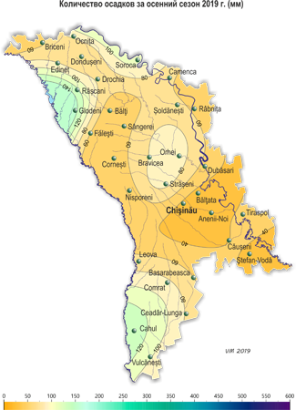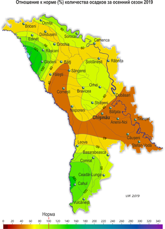 Значительный недобор осадков наблюдался в ноябре, когда их сумма за месяц на 60% территории не превысила 3-10 мм (10-30% месячной нормы). Первый снежный покров отмечался 22-24 ноября в отдельных северных и южных районах республики, его высота на метеорологических площадках не превысила 2 см (МС Комрат). В течение сезона наблюдались стихийные метеорологические явления в виде очень сильных дождей: – 3 сентября на АМП Глодень за 4 ч выпало 66 мм осадков; – 26 сентября на ГП Думень за 1 ч выпало 43 мм; – 27 сентября на МС Кахул за 12 ч выпало 65 мм. Также в течение сезона отмечались туманы, грозы, град, усиление скорости ветра до 24 м/с (сентябрь, МС Сорока), гололедно-изморозевые отложения, гололедица на дорогах. По сравнению с осенью 2018 г. средняя температура воздуха за этот сезон была на 1-2ºС выше и местами выпало меньшее количество осадков (на 50-80 мм). Годом-аналогом по температурному режиму является 2012 г. По данным агрометеорологических наблюдений погодные условия осени были в основном благоприятными для созревания овощей, фруктов и винограда. Из-за отсутствия существенных осадков и низких запасов продуктивной влаги в пахотном слое почвы большую часть осени отмечались в основном неблагоприятные условия для проведения сева озимых культур. К севу озимых культур отдельные сельскохозяйственные производители приступили во второй декаде сентября. Массовый сев проводился в октябре. По состоянию на 28 сентября запасы продуктивной влаги под зябью и на посевах озимой пшеницы на большей части территории составляли в пахотном слое почвы 1-12 мм(5-65% нормы), на остальной территории – 16-45 мм (95-175% нормы). В метровом слое почвы на 55% территории запасы продуктивной влаги составляли 14-55 мм (15-65% нормы), на остальной территории – 65-115 мм (70-115% нормы). В течение сентября в хозяйствах республики собирали урожай подсолнечника, кукурузы, сахарной свеклы, овощных, плодовых культур и винограда. Заморозки в воздухе и на поверхности почвы создавали угрозу повреждения неубранного урожая овощных культур. По состоянию на 28 сентября запасы продуктивной влаги под многолетними насаждениями в метровом слое на 60% территории составляли в основном 60-115 мм (70-105% нормы), на остальной территории – 30-45 мм (35-55% нормы). Погодные условия в течение октября были удовлетворительными для завершения уборки урожая поздних сельскохозяйственных культур, а также для проведения сева озимых культур, их роста и развития. На посевах озимой пшеницы в течение месяца отмечались фазы: прорастание зерна и всходы. К концу октября на ранних посевах сформировался третий лист. Отдельные хозяйства завершали сев озимых культур. Развитие озимых культур в этом году из-за поздних сроков сева проходило в основном на месяц позже обычного. По состоянию на 28 октября запасы продуктивной влаги под озимыми культурами и на участках, предназначенных под их посев, в пахотном слое почвы составляли на 50% территории 15-25 мм (65-125% нормы), на остальной – 5-10 мм (20-45% нормы). В метровом слое почвы запасы продуктивной влаги на 60% территории составляли 20-60 мм (20-65% нормы), на остальной территории – 65-100 мм (75-95% нормы). Дефицит осадков, а также низкие запасы продуктивной влаги в пахотном слое почвы, создавали не вполне благоприятные условия для роста и развития озимых культур в течение ноября. В первой половине ноября у озимой пшеницы на большей час