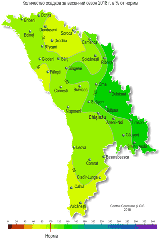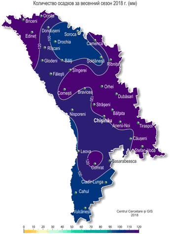 Осадки в течение сезона выпадали неравномерно. Особенно много выпало в марте, когда их сумма за месяц составила в основном 60-120 мм (200-420% месячной нормы), что на 65% территории наблюдается в среднем один раз в 20-30 лет. Значительный недобор осадков наблюдался в апреле, когда их сумма за месяц на 80% территории, в основном в центральных и южных районах республики, не превысила 1-5 мм (5-15% месячной нормы), а местами они не выпадали. Недобор осадков сохранялся и в мае. Их количество за период апрель-май составило по территории в основном 10-50 мм (10-55% нормы), что отмечается в среднем один раз в 10-30 лет. В течение весеннего сезона отмечались стихийные метеорологические явления в виде сильных снегопадов с количеством осадков 20-26 мм за 12 ч (18 и 23 марта). В марте почти повсеместно большую часть месяца (1-8 и 18-28 марта) сохранялся снежный покров. Его максимальная высота на метеорологических площадках достигала 33 см (24 марта, МС Дубэсарь). Также в течение сезона наблюдались гололедно-изморозевые отложения, гололедица на дорогах, туманы, усиление скорости ветра до 20 м/с, грозы, град. По сравнению с весной 2017 г. этот сезон был аналогичным по температурному режиму и с меньшим количеством осадков (на 30-70 мм). Переход средней суточной температура воздуха через +5°С в этом году отмечался 29-30 марта, что в центральных и южных районах на неделю позже обычных сроков, в северных районах в основном в сроки, близкие к обычным. В большинстве дней марта озимые культуры находились в состоянии вегетационного покоя. Возобновление вегетации озимых культур наступило 30-31 марта, что на 1-2 недели позже обычных сроков. На большей части территории республики озимые культуры находились в фазе кущения, местами – в фазе третий лист. Многолетние насаждения в течение месяца на территории республики находились в состоянии вегетационного покоя. В конце марта в крайних южных районах отмечено набухание почек у абрикоса и ранних сортов черешни, что близко к средним многолетним датам. Устойчивый переход средней суточной температуры воздуха через +10°С, характеризующий начало активной вегетации сельскохозяйственных культур, наступил 31 марта - 4 апреля, что на 2 недели раньше обычных сроков. В первой половине апреля погодные условия были в основном благоприятными для роста и развития озимых, плодовых культур и винограда, а также для проведения сева и появления всходов яровых культур. Во второй половине месяца повышенный температурный режим и дефицит осадков способствовали интенсивному испарению влаги из верхних слоев почвы, что ухудшило условия для роста развития озимых и яровых культур и проведения сева технических культур. У озимых культур в течение апреля отмечались фазы: кущение и выход в трубку. По состоянию на 28 апреля запасы продуктивной влаги под озимыми культурами в пахотном слое почвы на большей части территории республики были низкими и составляли 5-15 мм (15-65% нормы), местами, преимущественно в северных районах, они равнялись 20-35 мм (70-125% нормы). В метровом слое почвы запасы продуктивной влаги составляли в основном 100-165 мм (75-130% нормы), местами – 60-90 мм (55-65% нормы). В течение апреля хозяйства республики проводили сев ярового ячменя, гороха, сахарной свеклы, подсолнечника, во второй половине апреля приступили к севу кукурузы. Средняя температура почвы на глубине 10 см в течение месяца кол