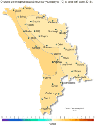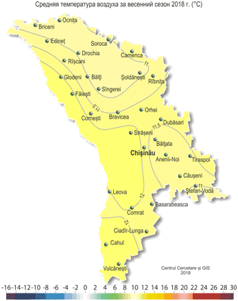 Весна 2018 г. в Республике Молдова была теплой и короткой. Начало метеорологической весны (т.е. устойчивый переход средней суточной температуры воздуха через 0°С в сторону повышения) наблюдалось повсеместно 6-7 марта, что в северных районах в пределах обычного, а в южных – на 1 неделю позже обычных сроков. Ее окончание (устойчивый переход средней суточной температуры воздуха через 15ºС) на большей части территории республики отмечалось 9-11 апреля, что на один месяц раньше средних многолетних дат и отмечается в среднем один раз в 30 лет. Средняя температура воздуха за сезон (март-май) составила по территории +10,7..+12,3°С, что на 1,6-2,7°С выше нормы и отмечается в среднем один раз в 5-10 лет.
