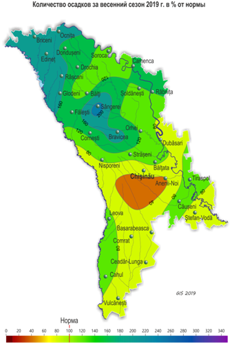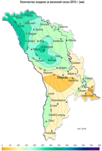 Осадки в течение сезона выпадали неравномерно. Значительный недобор осадков наблюдался в марте, когда их количество за месяц не превысило по территории в основном 1-15 мм (2-45% месячной нормы). Особенно много осадков выпало в мае, когда их сумма за месяц местами в северной половине республики (30% территории) достигала 140-225 мм (250-400% месячной нормы), что в этих районах наблюдается впервые за весь период наблюдений. В течение весеннего сезона отмечались стихийные метеорологические явления в виде очень сильных дождей: – 18 мая на МС Бричень, Бравича и АМП Единец, Дрокия за 12 ч и менее выпало 52-72 мм осадков; – 24 мая на МС Бравича за 3 ч выпало 80 мм осадков. Прошедшие сильные дожди в мае, местами с градом, вызвали повреждения сельскохозяйственных культур, народнохозяйственных объектов и отключение электроэнергии. 10-11 марта на большей части территории республики наблюдалось усиление скорости ветра до 16-23 м/с, местами наблюдалась пыльная буря. В отдельных районах, 11 марта, скорость ветра достигала 28 м/с (МС Сорока, Бэлць, Корнешть), что является стихийным метеорологическим явлением. В результате сильного ветра отмечалось повреждение линий электропередач, народнохозяйственных объектов и сельскохозяйственных угодий. Также в течение сезона наблюдались туманы, грозы, град. По сравнению с весной 2018 г. этот сезон был аналогичным по среднему температурному режиму и местами с большим количеством осадков (на 50-100 мм). Переход средней суточной температура воздуха через +5°С в этом году отмечался 4 марта, что на 15-25 дней раньше обычных сроков. В первой половине марта у озимых культур отмечались фазы: третий лист, кущение, местами – всходы. Во второй половине месяца на большей части территории озимые раскустились, местами отмечался третий лист. Число растений на 1 м2 составляло в основном 335-460, местами – 230-315. На раскустившихся растениях сформировалось в среднем по 2 стебля. Высота растений в зависимости от фазы развития составляла в основном 11-21 см. По состоянию на 28 марта запасы продуктивной влаги в почве под озимыми культурами в пахотном слое составляли на 60% территории 25-40 мм (75-125% нормы), на остальной территории, преимущественно в южной половине республики – 10-20 мм (30-65% нормы), в метровом слое почвы они составляли в основном 115-185 мм (80-135% нормы), местами – 65-95 мм (45-65% нормы). У основных плодовых культур в марте отмечалось набухание почек, распускание почек и развертывание первых листьев. У ранних сортов абрикоса и персика к концу месяца, преимущественно в южной половине республики, началось цветение, что в среднем на 3 недели раньше обычных сроков. У винограда в середине месяца местами началось сокодвижение, к концу месяца - продолжалось сокодвижение, местами отмечалось набухание глазков. По состоянию на 28 марта запасы продуктивной влаги под многолетними насаждениями в метровом слое почвы составляли в основном 120-165 мм (80-105% нормы), местами в южных районах они не превышали 90-110 мм (65-70% нормы). Во второй половине марта отдельные хозяйства республики приступили к севу ранних яровых культур и сахарной свеклы. Средняя температура почвы на глубине 5 и 10 см в течение месяца колебалась от +5ºC до +10ºС. Устойчивый переход средней суточной температуры воздуха через 10°С, характеризующий начало активной вегетации сельскохозяйственных культур, наступил 21 апреля – в сроки, б