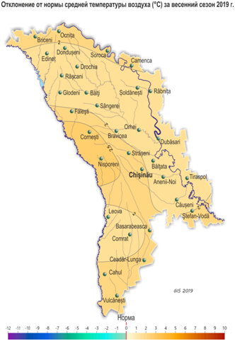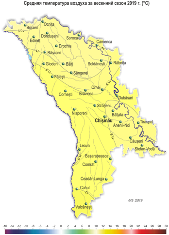 Весна 2019 г. в Республике Молдова была теплой и местами с сильными осадками. Начало метеорологической весны (т.е. устойчивый переход средней суточной температуры воздуха через 0°С в сторону повышения) наблюдалось повсеместно 28-29 января, что на месяц раньше средних многолетних дат, а ее окончание – 12-13 мая, что близко к обычным срокам. Средняя температура воздуха за сезон (март-май) составила по территории +10,4..+12,0°С, что на 1,6-2,7°С выше нормы и отмечается в среднем один раз в 5-10 лет.