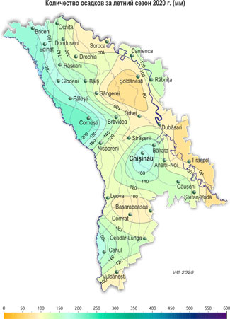 Наибольшее количество осадков выпало в июне, когда их сумма за месяц на 85% территории составила 55-130 мм (75-165% нормы). В июле и августе на большей части территории наблюдался недобор осадков. Так, сумма осадков за этот период на 80% территории не превысила 15-60 мм (15-45% нормы). В течение летнего сезона отмечались стихийные метеорологические явления в виде сильных ливней и града (июнь, июль), которые вызвали повреждения сельскохозяйственных культур, народнохозяйственных объектов и отключение электроэнергии. Повышенный температурный режим и значительный дефицит осадков, отмечавшиеся на территории Республики Молдова большую часть лета (июль-август) способствовали возникновению атмосферной и почвенной засух. Гидротермический коэффициент Селянинова (ГТК), характеризующий степень увлажнения территории, в среднем по республике в июле составил 0,5, в августе - 0,2, что соответствует сильной и очень сильной засухе. По сравнению с летом 2019 г. этот сезон был аналогичным по среднему температурному режиму и с меньшим количеством осадков (на 20-100 мм). Из-за засушливой погоды, наблюдавшейся в июле и в августе на большей части территории страны, сложились неблагоприятные условия для формирования урожая кукурузы, подсолнечника, сахарной свеклы, а также для роста и развития овощных и других сельскохозяйственных культур. В течение июня погодные условия на большей части территории республики были удовлетворительными для роста, развития и формирования урожая сельскохозяйственных культур. Прошедшие дожди пополнили запасы продуктивной влаги в почве и улучшили условия для роста и развития сельскохозяйственных культур на большей части территории республики. У озимых зерновых культур в первой половине июня отмечалась молочная спелость, во второй половине началась восковая спелость, к концу месяца - полная спелость. Отдельные хозяйства приступили к уборке урожая. У кукурузы в течение июня продолжалось листообразование, к концу месяца сформировался в основном 11-13 лист, местами – 15-17 лист. Высота растений равнялась в основном 80-170 см, местами – 30-50 см. По состоянию на 28 июня запасы продуктивной влаги под кукурузой в полуметровом слое почвы на 70% территории составляли 45-80 мм (75-120% нормы), на остальной территории, преимущественно в южных районах – 20-40 мм (35-65% нормы) В метровом слое почвы на 65% территории – 75-190 мм (80-150% нормы), на остальной территории, преимущественно в южных районах – 50-70 мм (40-65% нормы). У подсолнечника в первой половине июня отмечалось формирование листьев, во второй половине - образование соцветий, к концу месяца местами началось цветение. Высота растений равнялась в основном 100-160 см, местами на поздних посевах – 40-70 см. По состоянию на 28 июня запасы продуктивной влаги под подсолнечником в полуметровом слое на 60% территории составляли 45-95 мм (75-160% нормы), на остальной территории – 20-40 мм (35-65% нормы), в метровом слое почвы запасы продуктивной влаги на 55% территории составляли 80-160 мм (75-140% нормы), на остальной территории – 45-70 мм (40-60% нормы). На посевах ярового ячменя в первой половине июня отмечалось колошение и молочная спелость, во второй половине - восковая спелость. У сахарной свеклы продолжался рост корнеплода, и отмечалось закрытие междурядий. У плодовых культур в основном продолжался рост плодов, у вишни, черешни, ранних сортов персика и абри