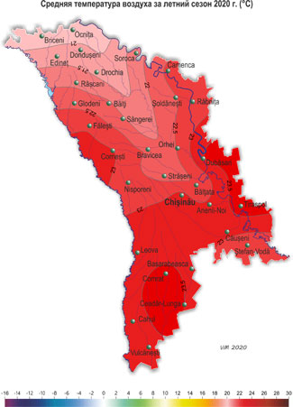 Лето 2020 г. в Республике Молдова было жарким и в основном с недобором осадков. Устойчивый переход средней суточной температуры воздуха через 15ºС, обусловливающий начало метеорологического лета, отмечался по территории республики преимущественно 4-5 июня, что на 15-20 дней позже обычных сроков. Средняя температура воздуха за сезон составила по территории +20,7..+23,7ºС, что в основном на 1,9-2,9ºС выше нормы и наблюдается в среднем один раз в 10-15 лет за весь период наблюдений, а за последнее 20-летие – в среднем один раз в 3-5 лет.